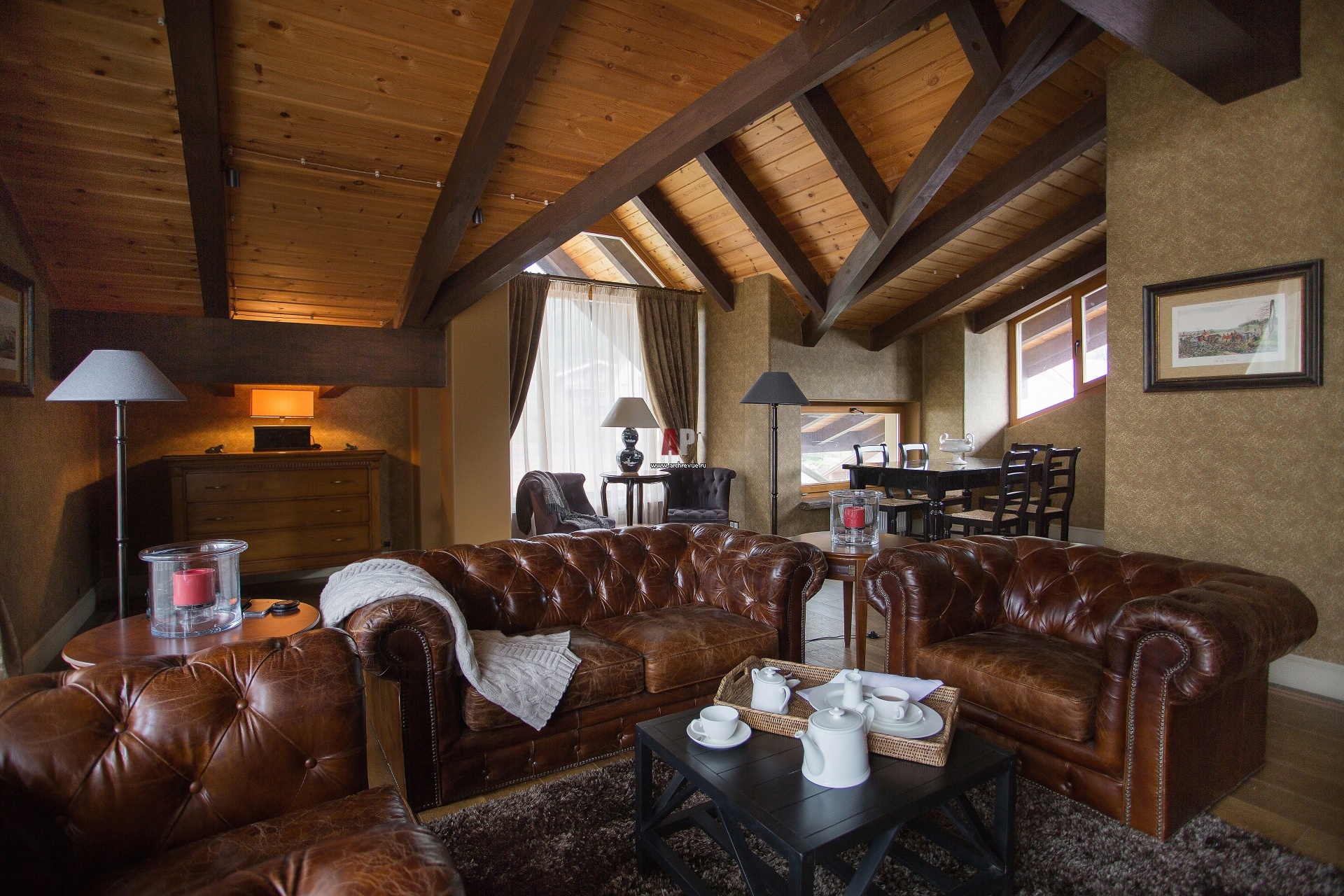 Потолки мансарды подшиты лиственницей с контрастными балками, стены оформлены бумажными обоями в классическом английском стиле. Диванная группа с обивкой из винтажной кожи.