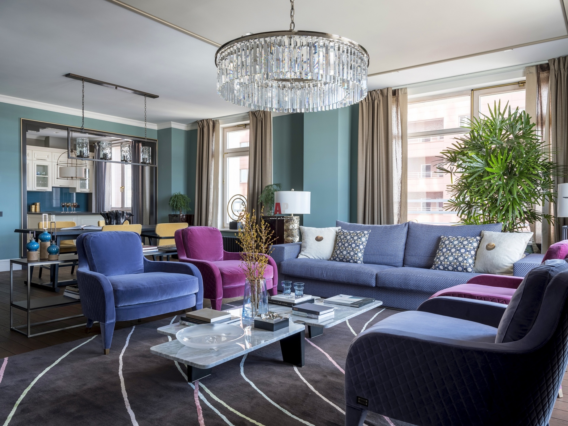 Интерьер гостиной с бирюзовыми стенами. Диван, Flexform, модель Magnum в ткани Holland & Sherry. Консоль, Meridiani, модель Hardy. Придиванные столики, Oasis, коллекция Hector. Журнальный стол Minotti, модель Jacob. Кресла, Rugiano, модель Emma.