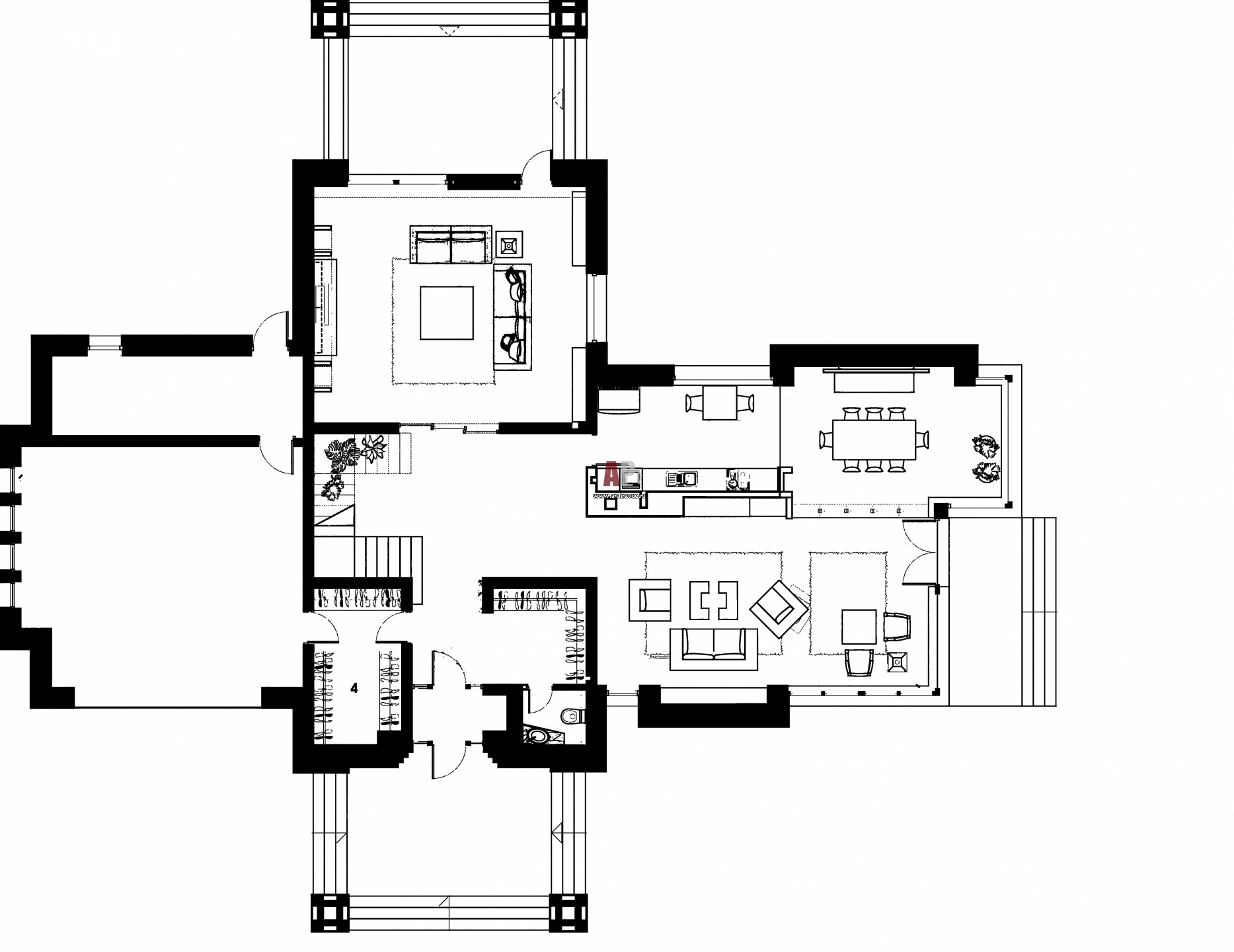 План первого этажа двухэтажного современного дома с африканскими мотивами. Общая площадь - 500 кв. м.