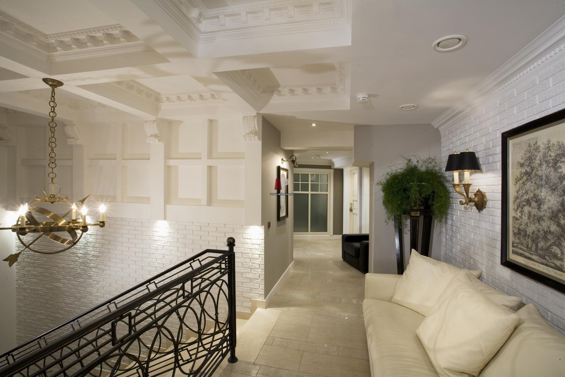 Расслабляющую обстановку создают детали: мебель из белой кожи, потолочная лепнина, белая настенная плитка «под кирпич» и напольный керамогранит сложного бежево-серого оттенка, поставщик «Керамос».