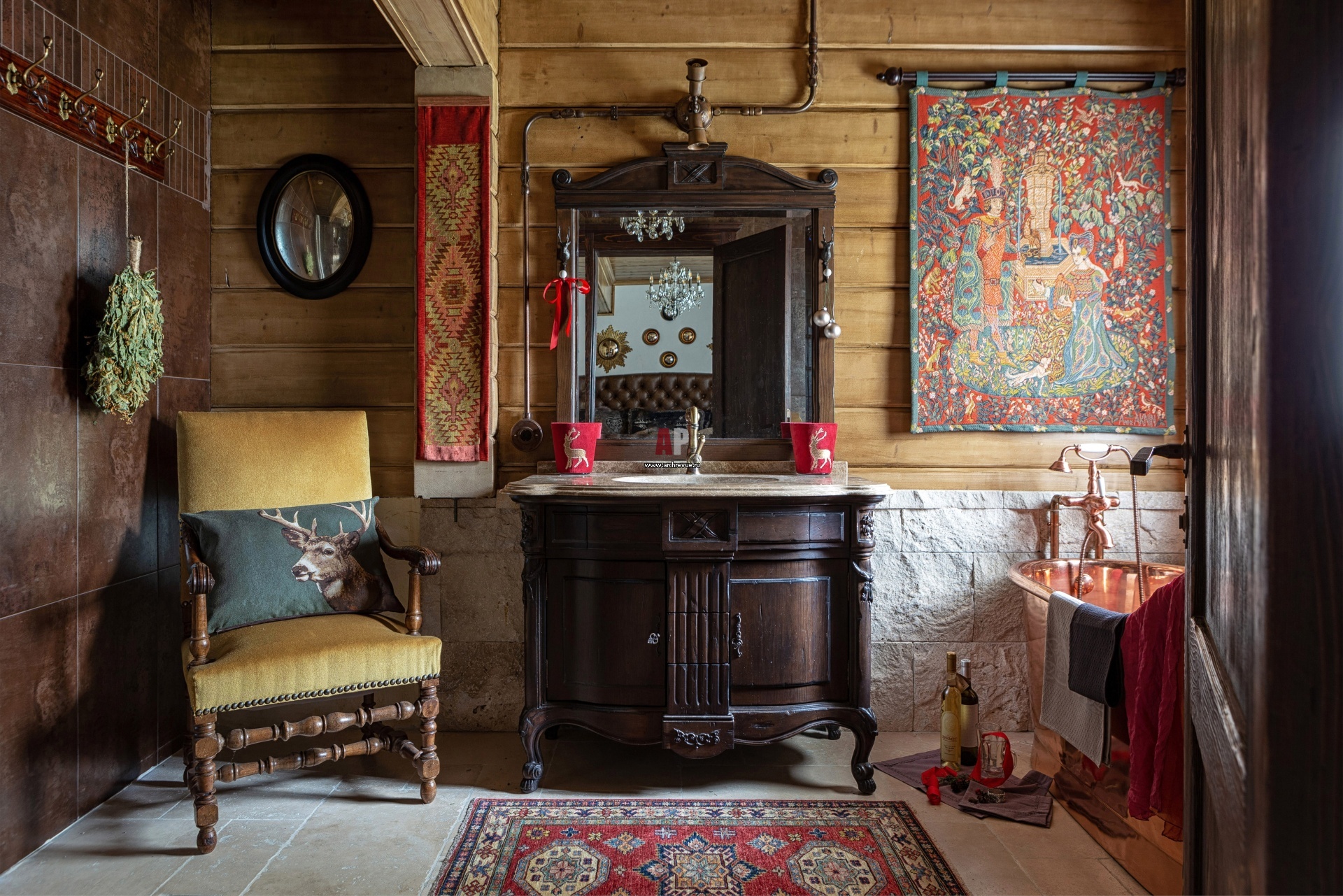 Главный санузел оформлен в стилистике шале. Керамогранит под ржавый металл в душевой вносит элемент брутальности. Перерубы закрыты специально сшитыми сонетками, в традиционных домах шале к ним крепился колокольчик для вызова прислуги.