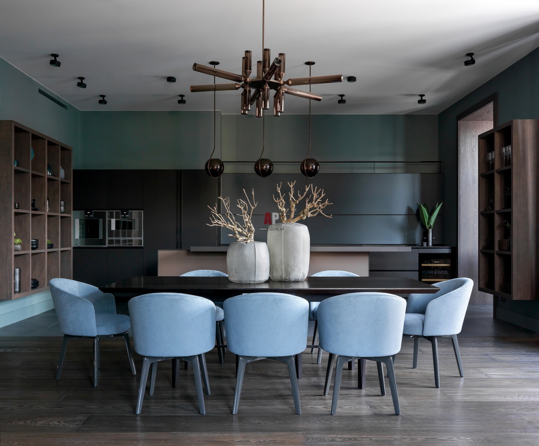 Обеденная зона в общей гостиной. Обеденный стол, Asher Israelow. Стулья, Minotti. Светильник над столом, Roll & Hill.
