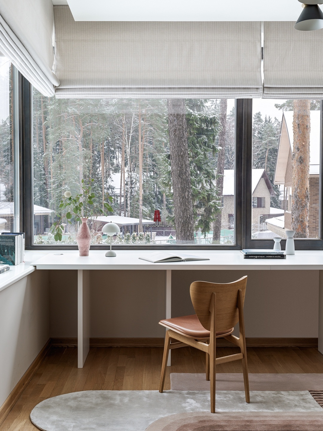 Женский кабинет на втором этаже. Рабочий стол придвинут к угловому широкому подоконнику и обращен на участок с соснами. Свет, &Tradition. Скульптура Льва Ефимова.