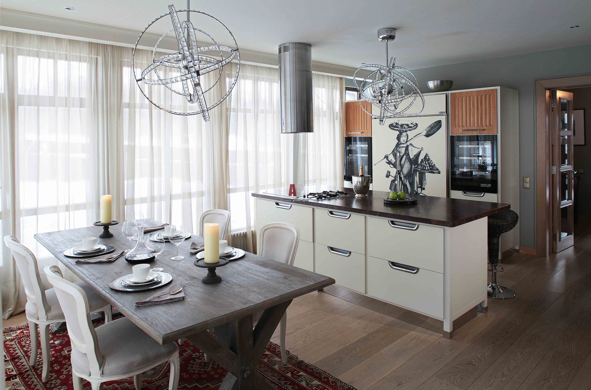 Кухня объединена со столовой и решена в современном стиле. Островной блок кухни Meneghini играет роль барной стойки. Вокруг нее размещены высокие барные стулья. Помещение освещают итальянские светильники ручной работы.