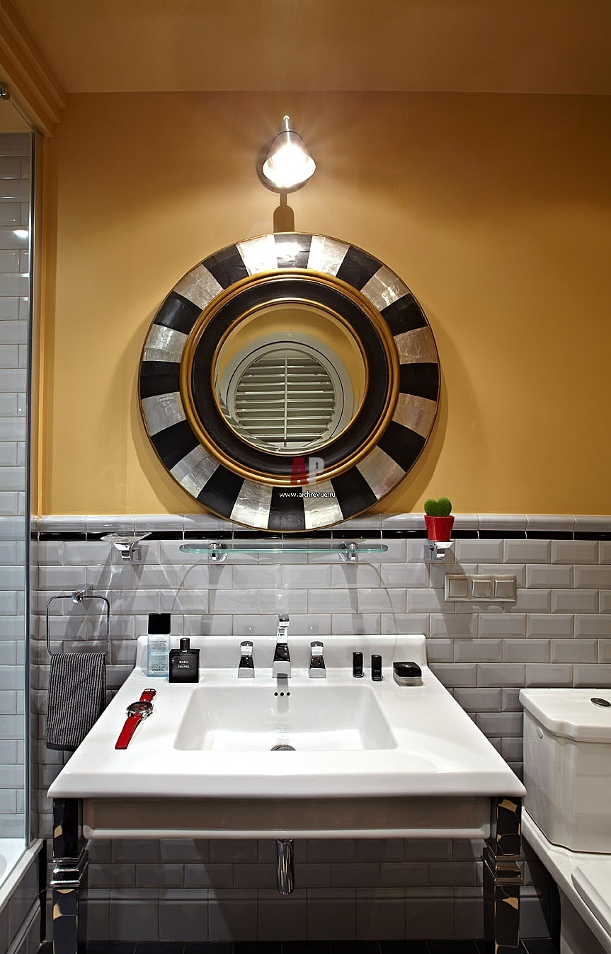 Между прихожей и санузлом сделано окно в виде иллюминатора. Со стороны входной зоны оно декорировано жалюзи, ванной комнаты – обыграно как зеркало в роскошной круглой раме. На стенах – плитка metro, Diffusion Ceramique (Франция), поставщик «Грета Вульф». Сантехника, Villeroy & Boch и Hueppe.