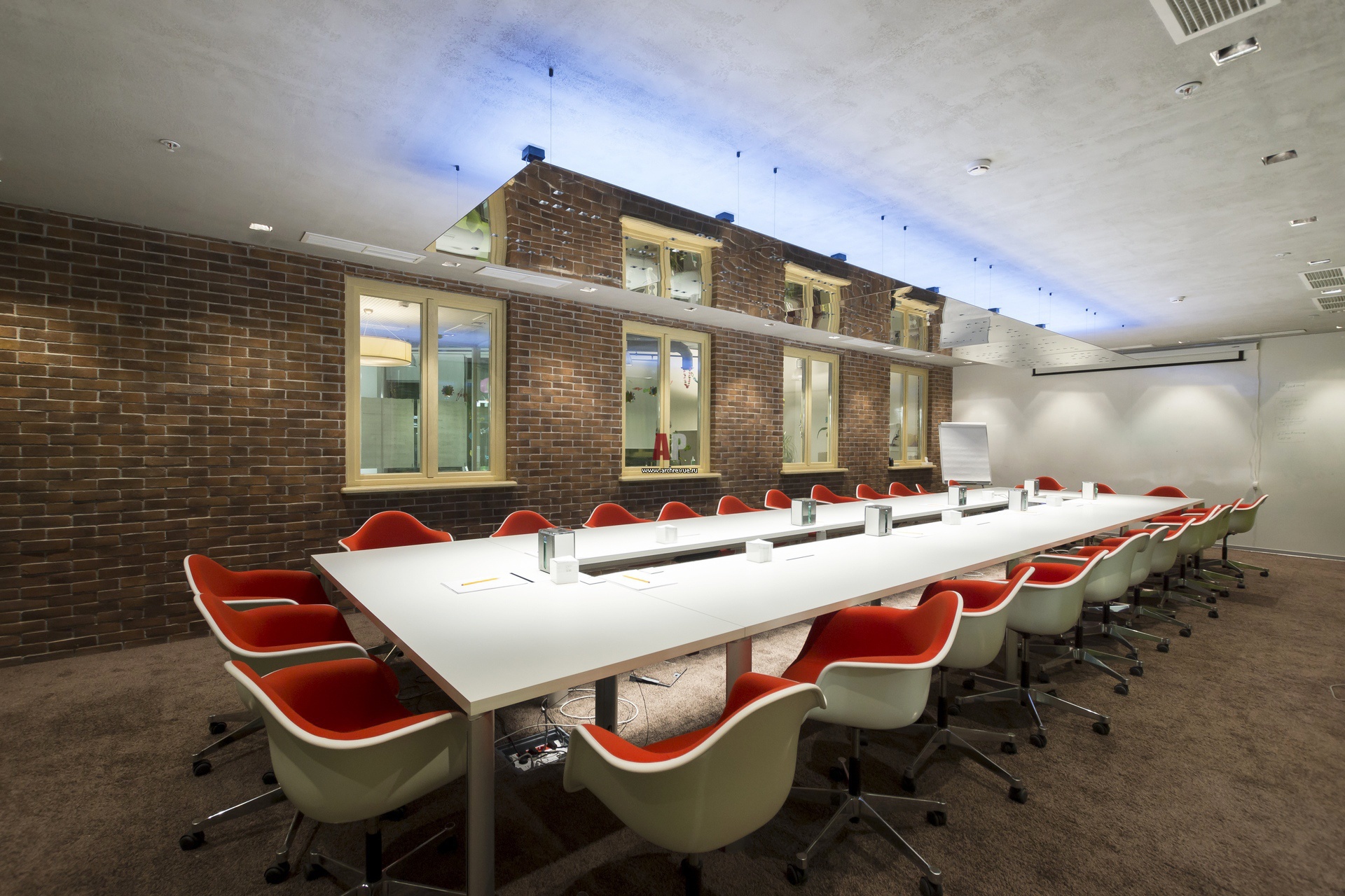 После демотнажа старой отделки во многих внутренних стенах обнаружились оконные проемы. Архитекторы вставили в них настоящие деревянные окна, облицевали стены кирпичом и придали интерьеру вид городской улицы с фасадами домов и мостовой.
