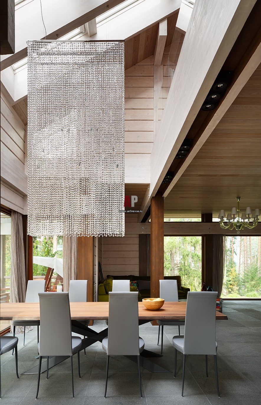 Интерьер зоны столовой. Графичный светильник Or Illuminazione с длинными ниспадающими хрустальными нитями сделан на заказ в Италии.