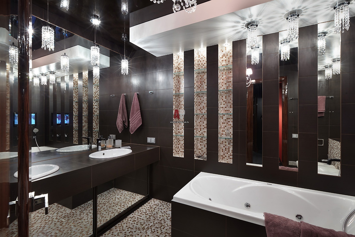Интерьер ванной комнаты в монохромных тонах. На полу – плитка, Atlas Concorde. А стенах – мозаика, Bisazza. Ванна, PoolSpa.