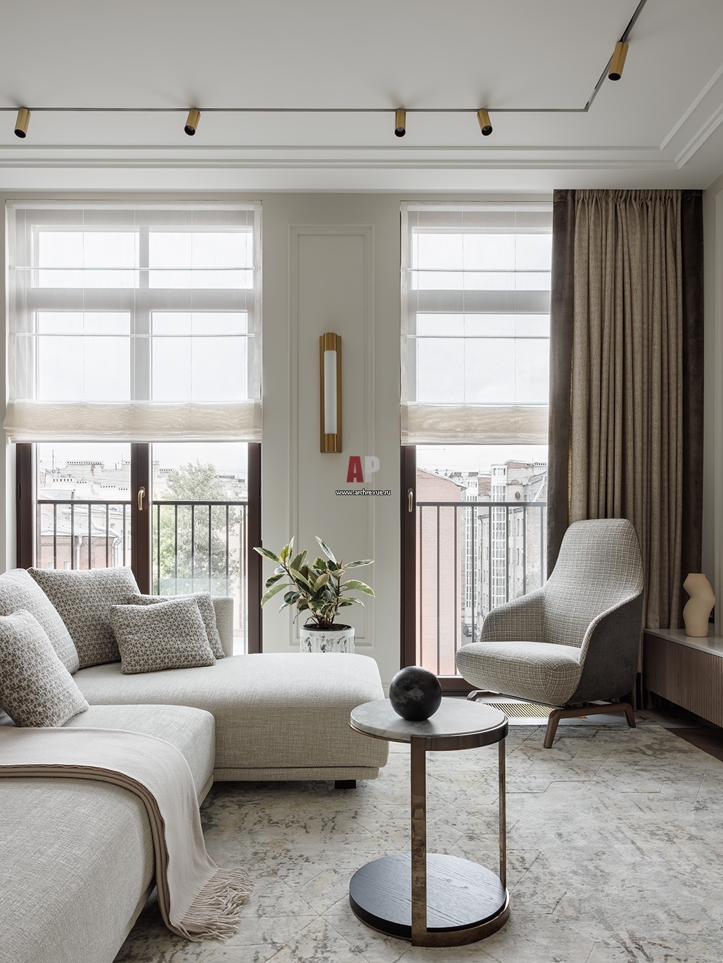 Исходное преимущество интерьера – большие окна – дизайнер подчеркнула с помощью светлых римских штор и коричневых портьер.