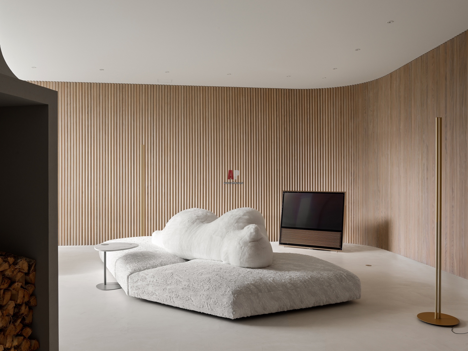 Стены гостиной зашиты деревянными рейками с треугольным сечением. Центром композиции служит диван Edra. Торшеры, Flos.