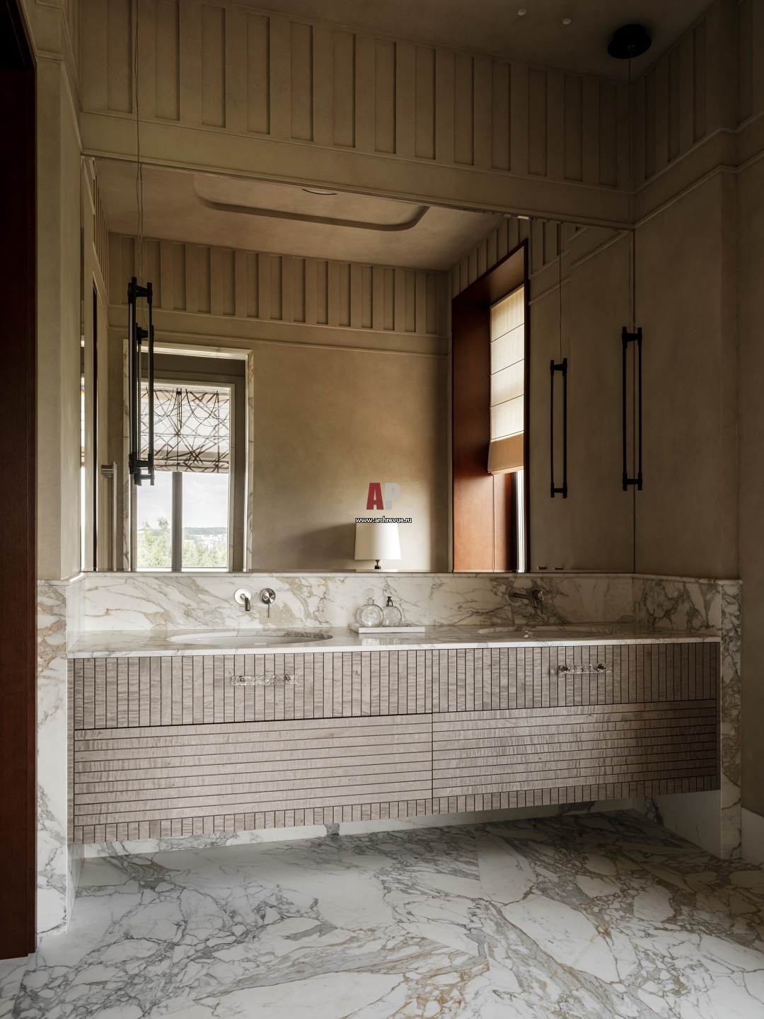 В мастер-ванной оттенки становятся холоднее и светлее. Акцент сделан на мрамор Calacatta Vagli. Белая в массе порода, с серыми прожилками имеет живописные включения розового и коричневого цвета, которые перекликаются с палитрой спальни. Консоль, по авторским эскизам, МДФ в эмали, сатинированный металл. Тумба для раковин с объемным фасадом выполнена из шпона сикоморо, ручки – из фактурного стекла. Смесители, Gessi.