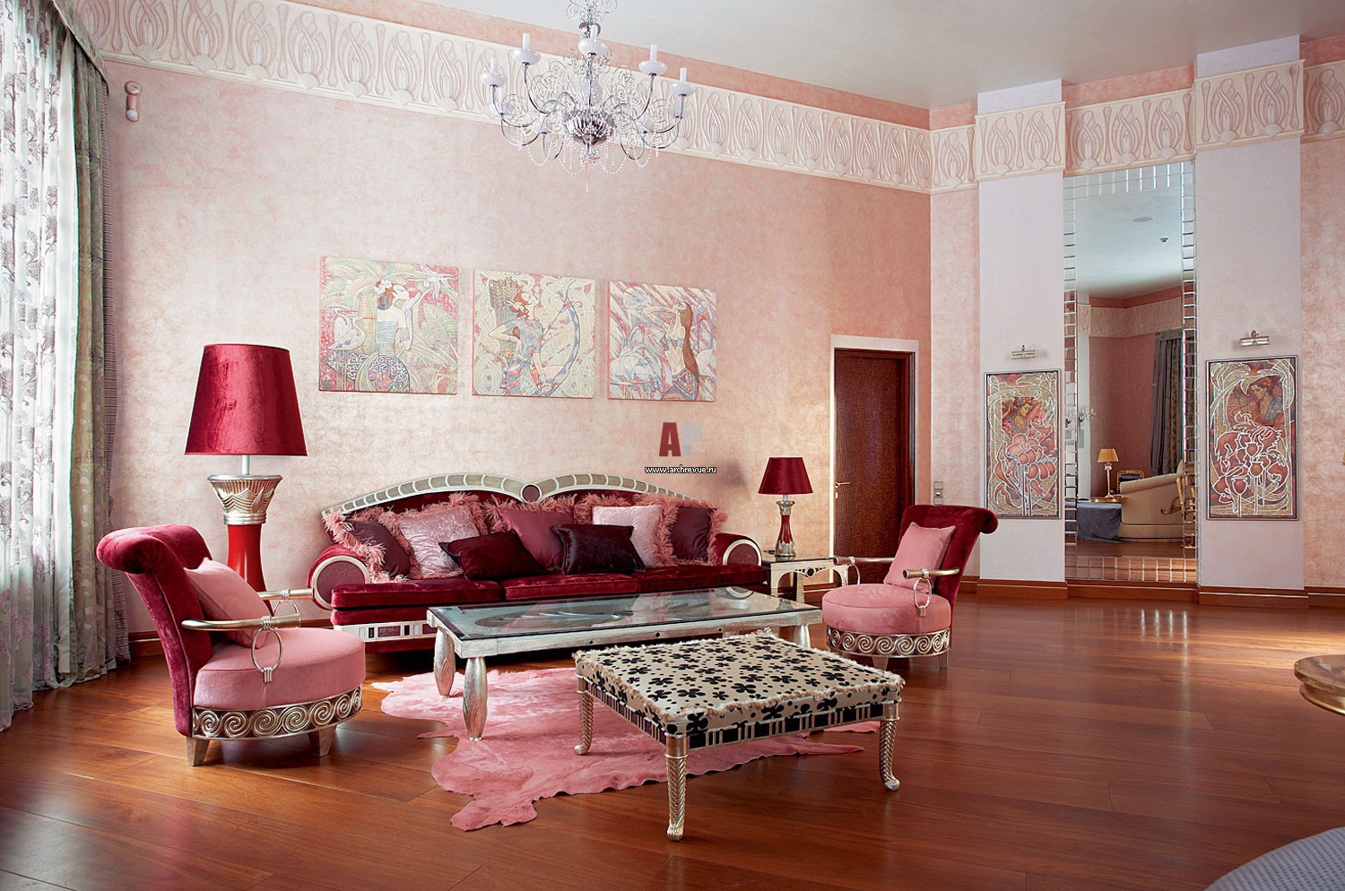 Стены декорированы декоративной покраской жизнеутверждающего розового оттенка, изготовление Interior Design & Decoration. Карниз оформлен высокой лепниной с рисунком в духе ар-деко, поставщик «Дворцовые интерьеры».