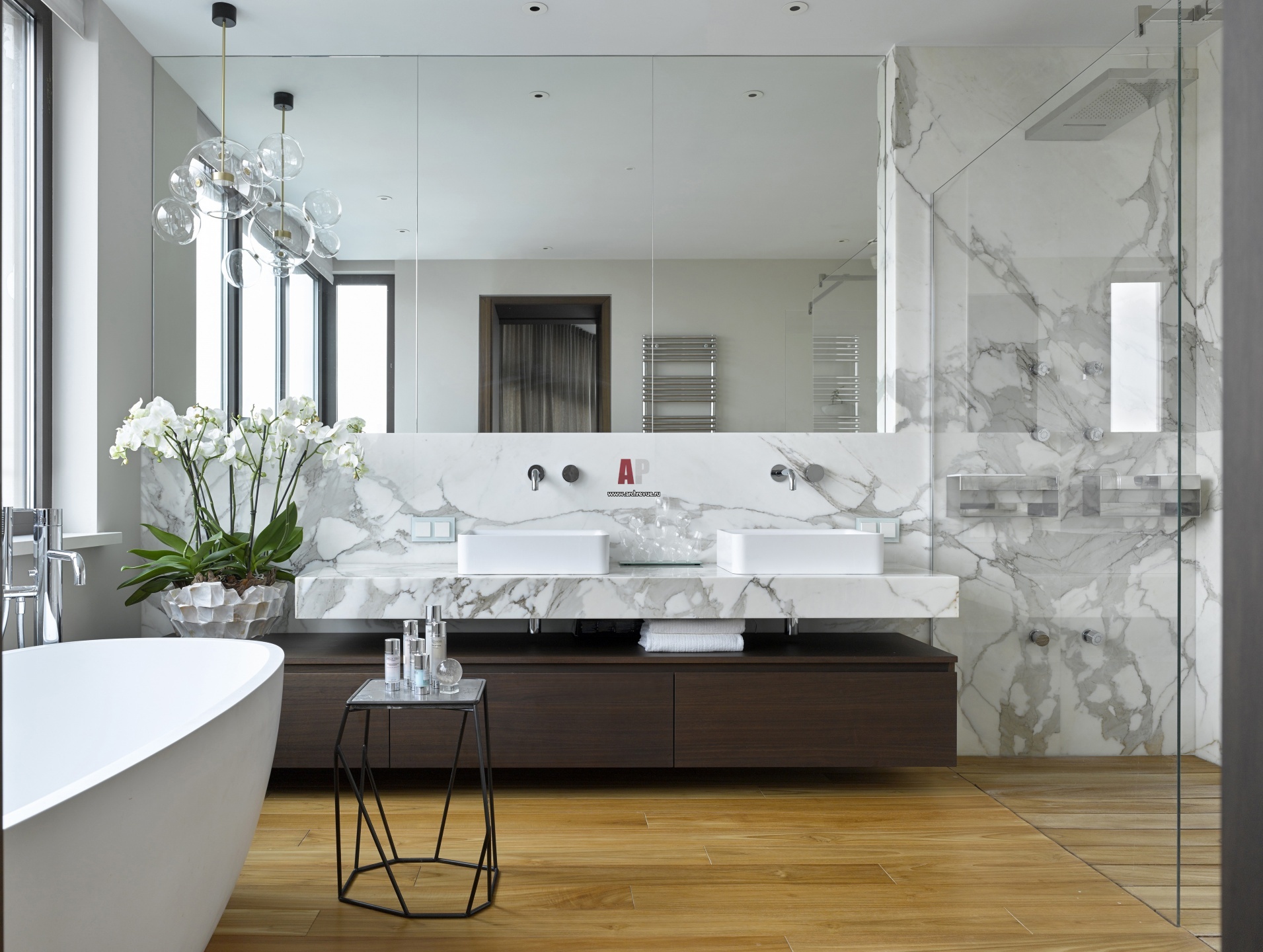 Хозяйский санузел. Стены облицованы мрамором Calacatta Extra. На полу – бирманский тик. Сантехника, Agape, Fantini, Antonio Lupi. Умывальник, на заказ. Люстра, Giopato & Coombes.