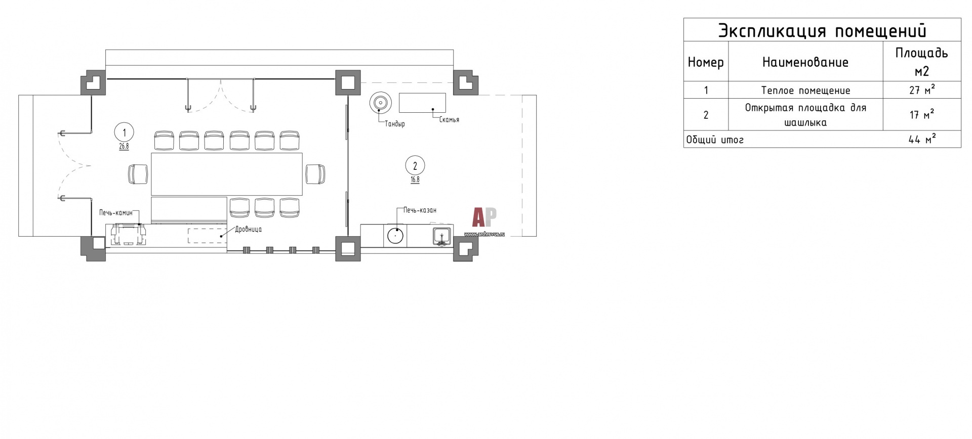 План отдельностоящего павильона-беседки с панорамными окнами, камином и кухней.