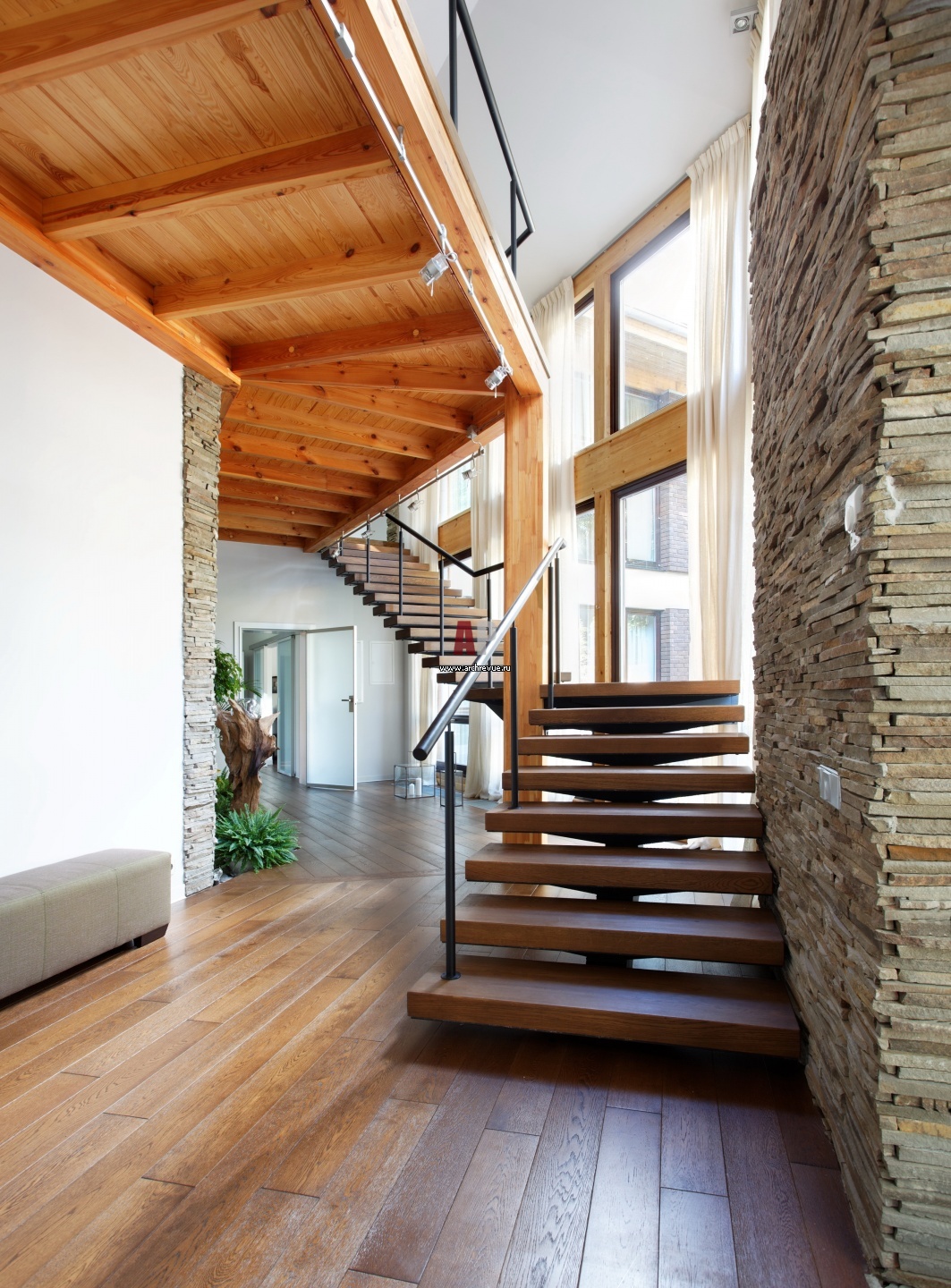 Интерьер входной группы. Основная декоративная идея проекта – сочетание чистых плоскостей и природных материалов, переходящих с фасада здания в интерьер, соединение эстетики минимализма и природной темы.