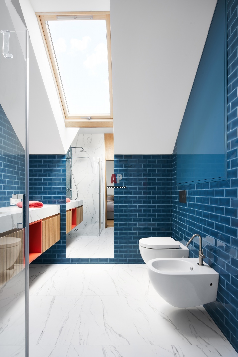 Хозяйский санузел в мансарде. Мансардное окно, VELUX. Санфаянс, Gruppo Sanitari Italia.