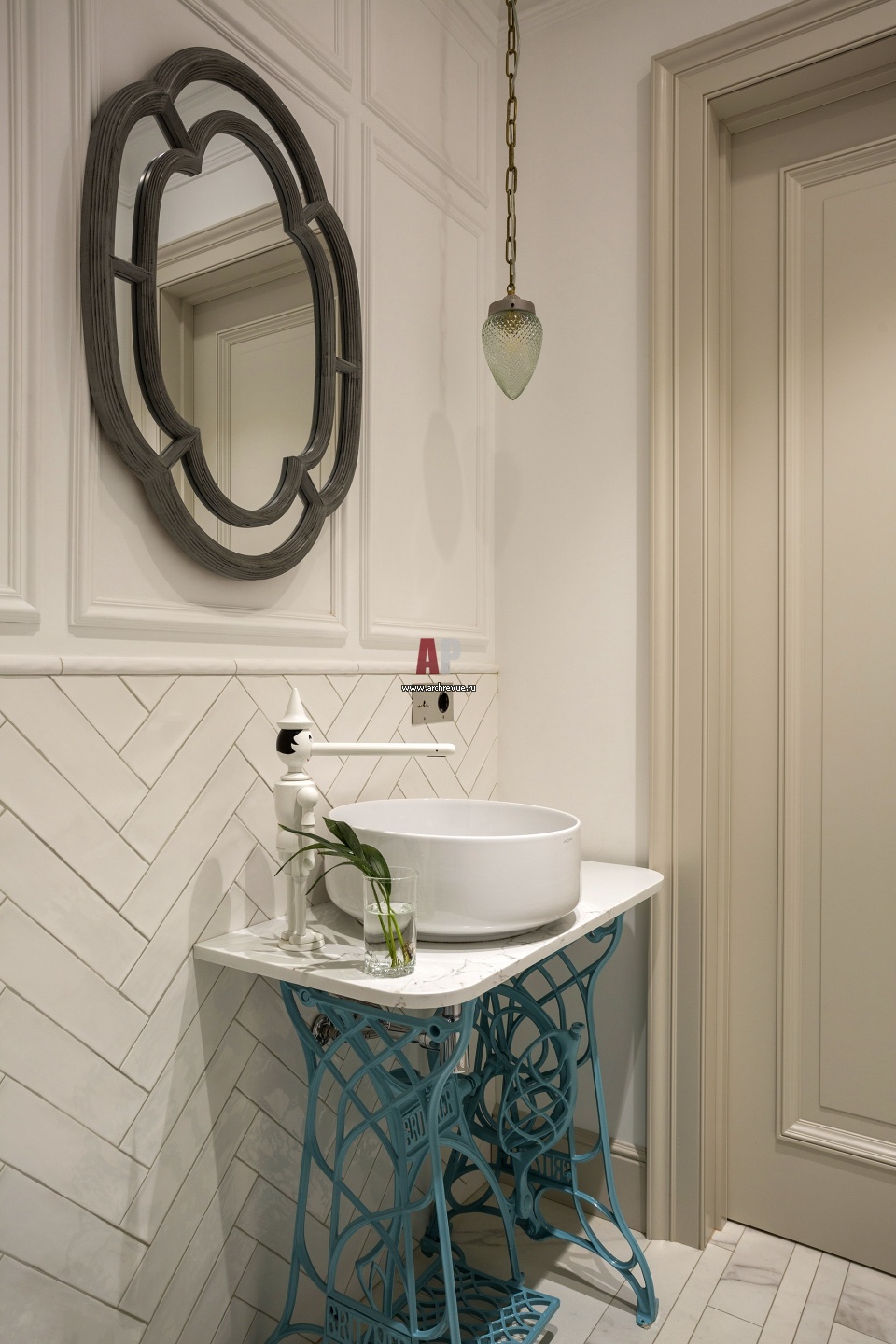 Детский санузел. Основанием для раковины служит корпус металлической швейной машинки. На подвесной лампе – советский плафон, такие раньше были почти во всех казенных местах.