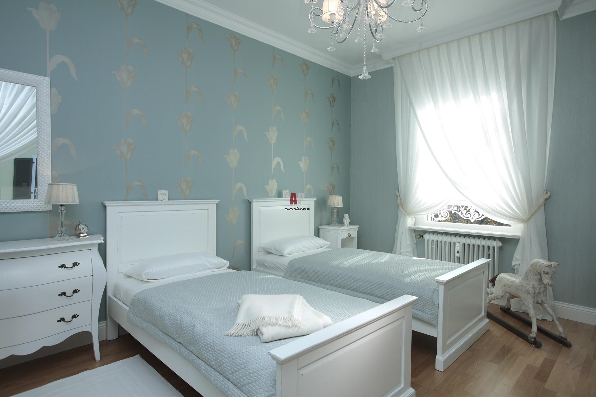 Детская для двоих детей в нежно-голубых тонах. Обои с изображением тюльпанов, Rasch. Мебель с белыми фасадами, Tonin Casa.