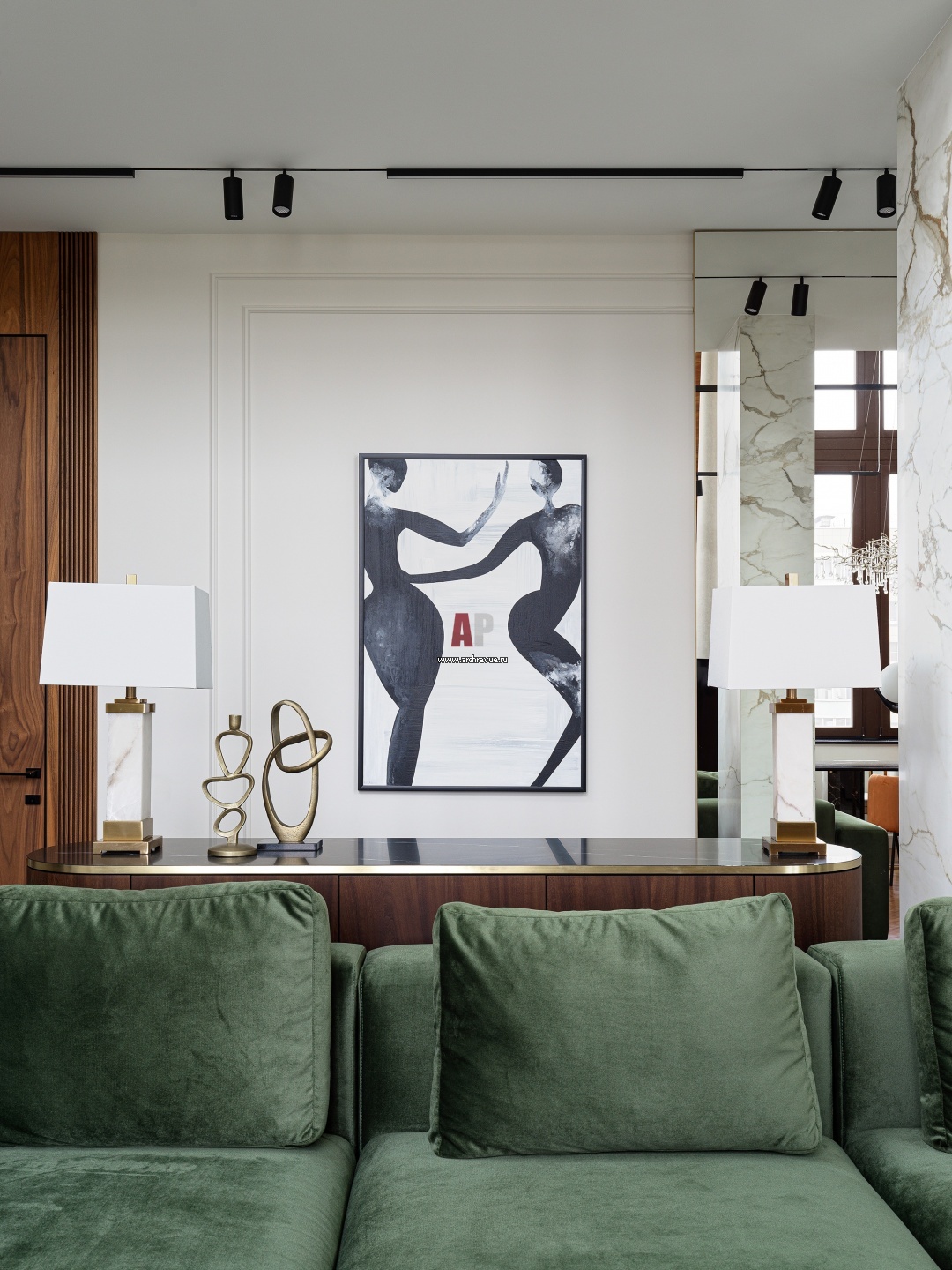 Двухэтажная квартира с элементами современной классики и эстетикой шика для семьи с тремя детьми. Гостиная.