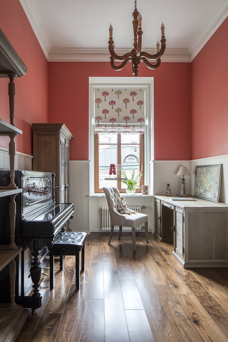 Верхняя часть стен в детской выкрашена в яркий терракотовый цвет, низ – облицован белыми деревянными панелями. Старинное пианино – семейная реликвия, доставшаяся по наследству.