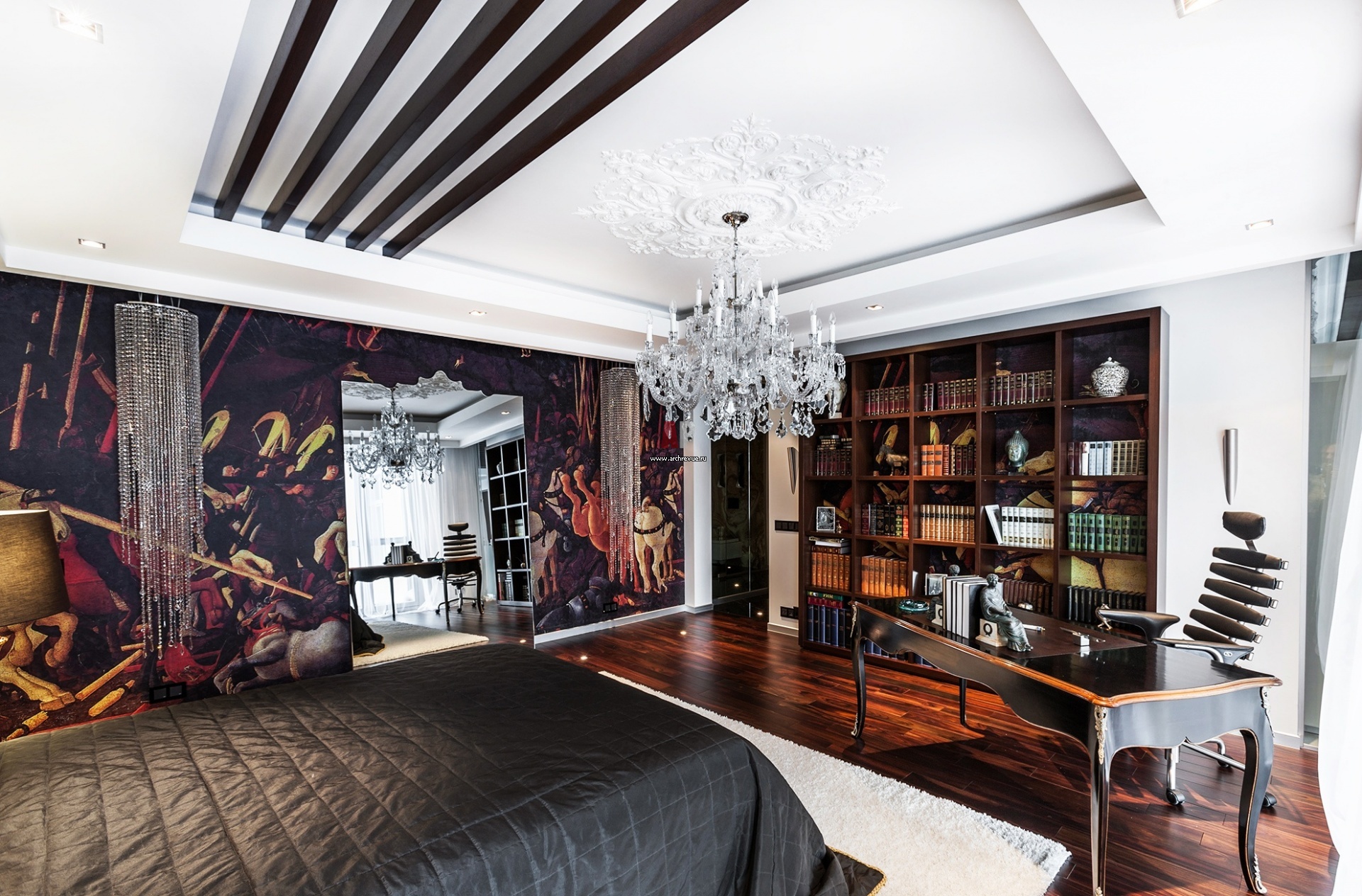 Декоративная пергола из венге отделяет зону кабинета от спальни. Письменный стол, Selva. Рабочее кресло, De Sede.