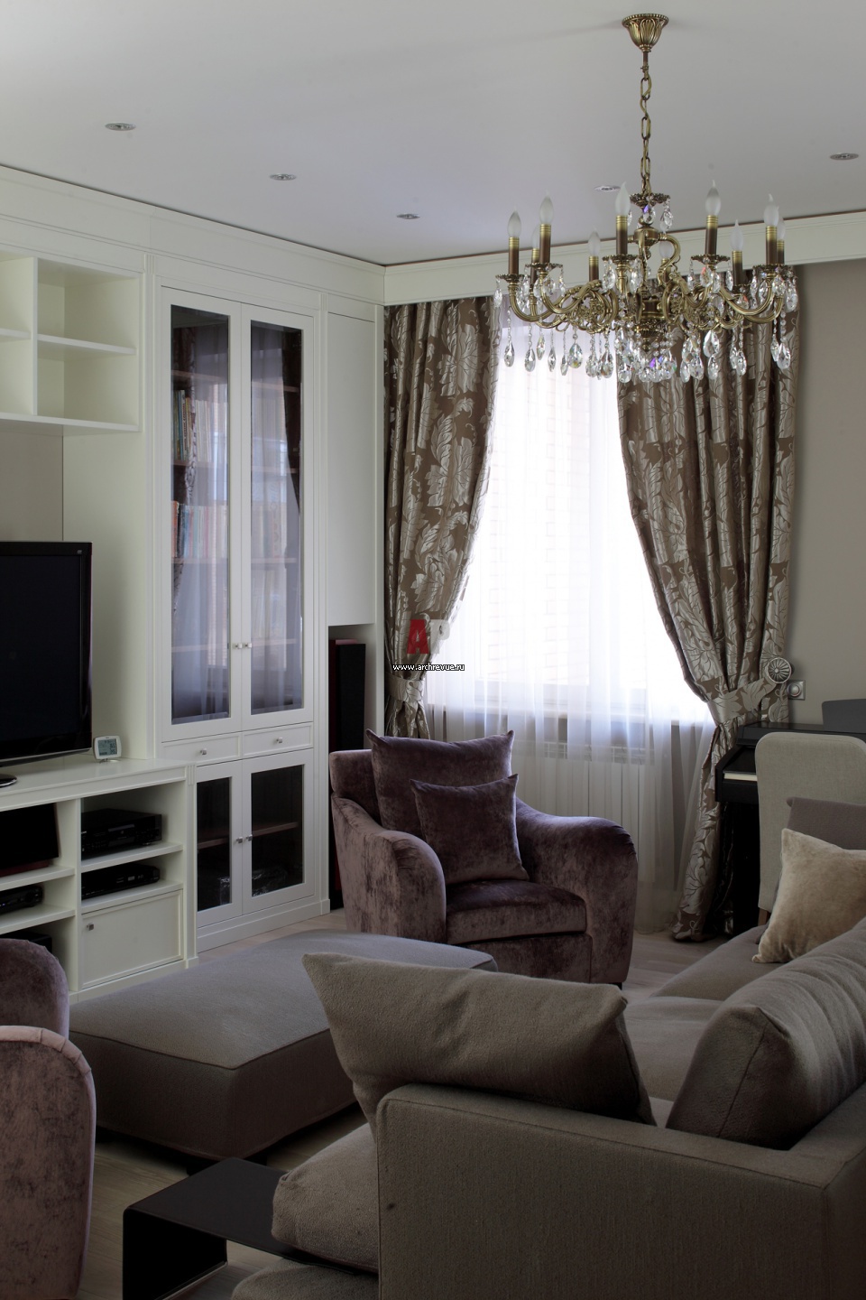 Интерьер в светлых тонах. Стены выкрашены в жемчужно-серый цвет. Покраски однотонные, Benjamin Moore.