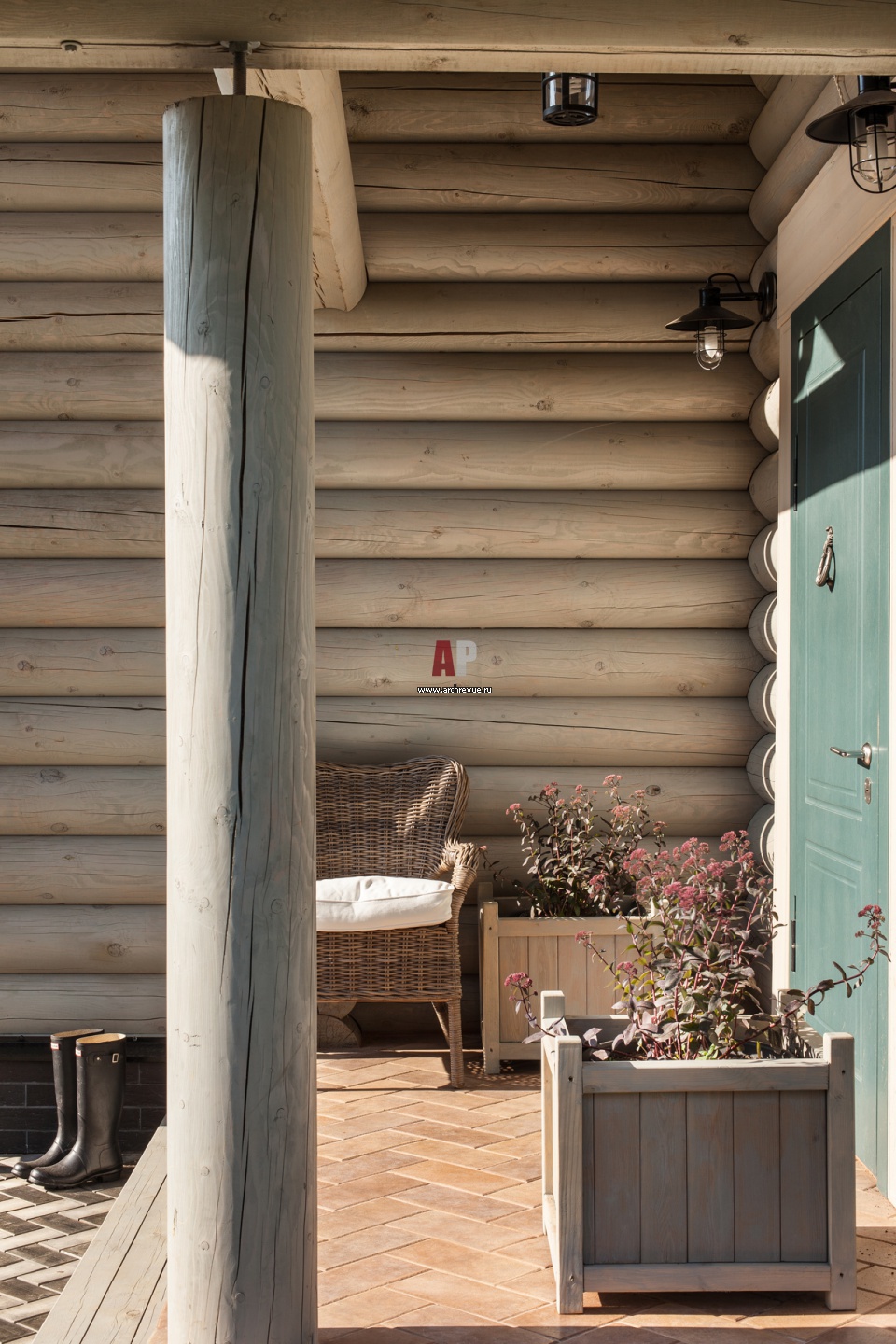Интерьер входной группы деревянного дома. Входная дверь выкрашена в пастельный зеленый цвет лессировочными красками, не скрывающими фактуру дерева.