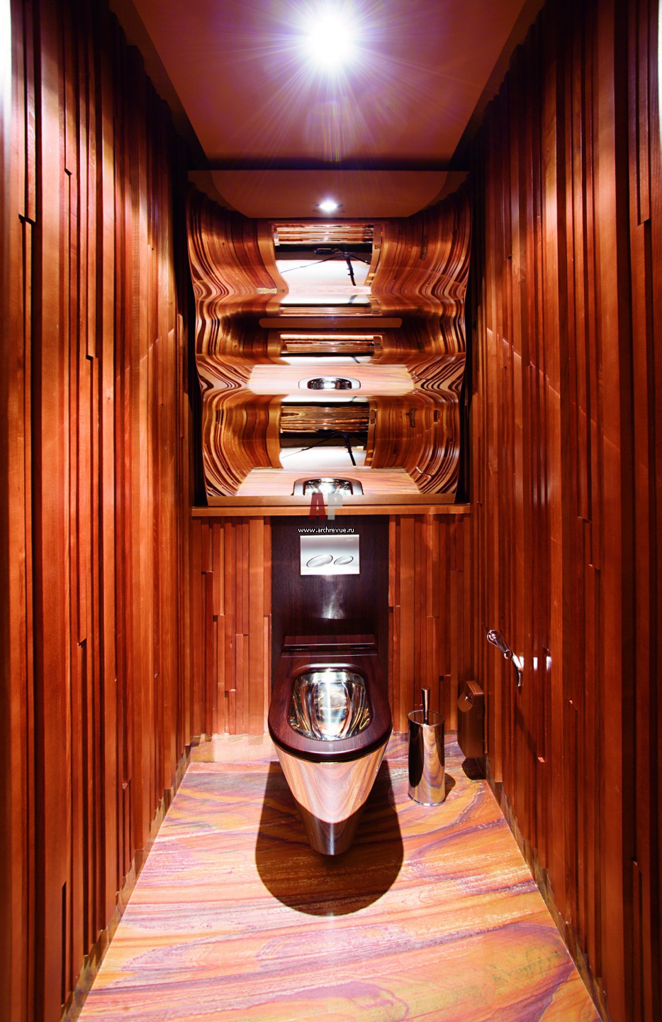 Санузлы ресторана зашиты деревом и декорированы гнутыми зеркалами.