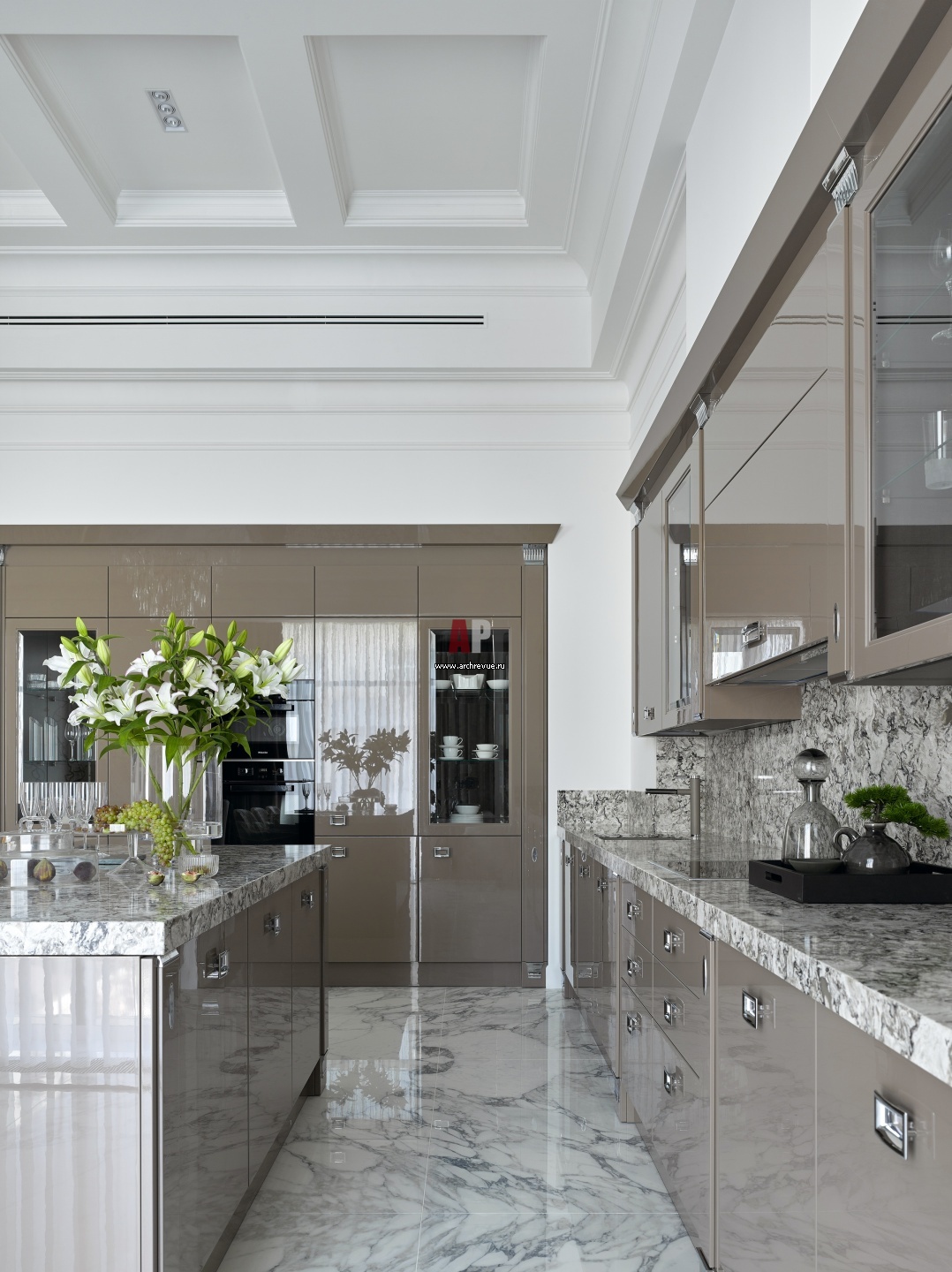 Кухня с глянцевыми фасадами цвета кофе с молоком не перегружает интерьер. Столешницы выполнены из кварца Cambria Bellingham.
