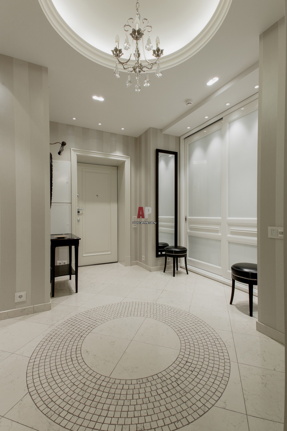 Прихожая цвета жасмина. Потолочный круг акцентирован напольным панно из мраморной мозаики. Мебель контрастного черного цвета.