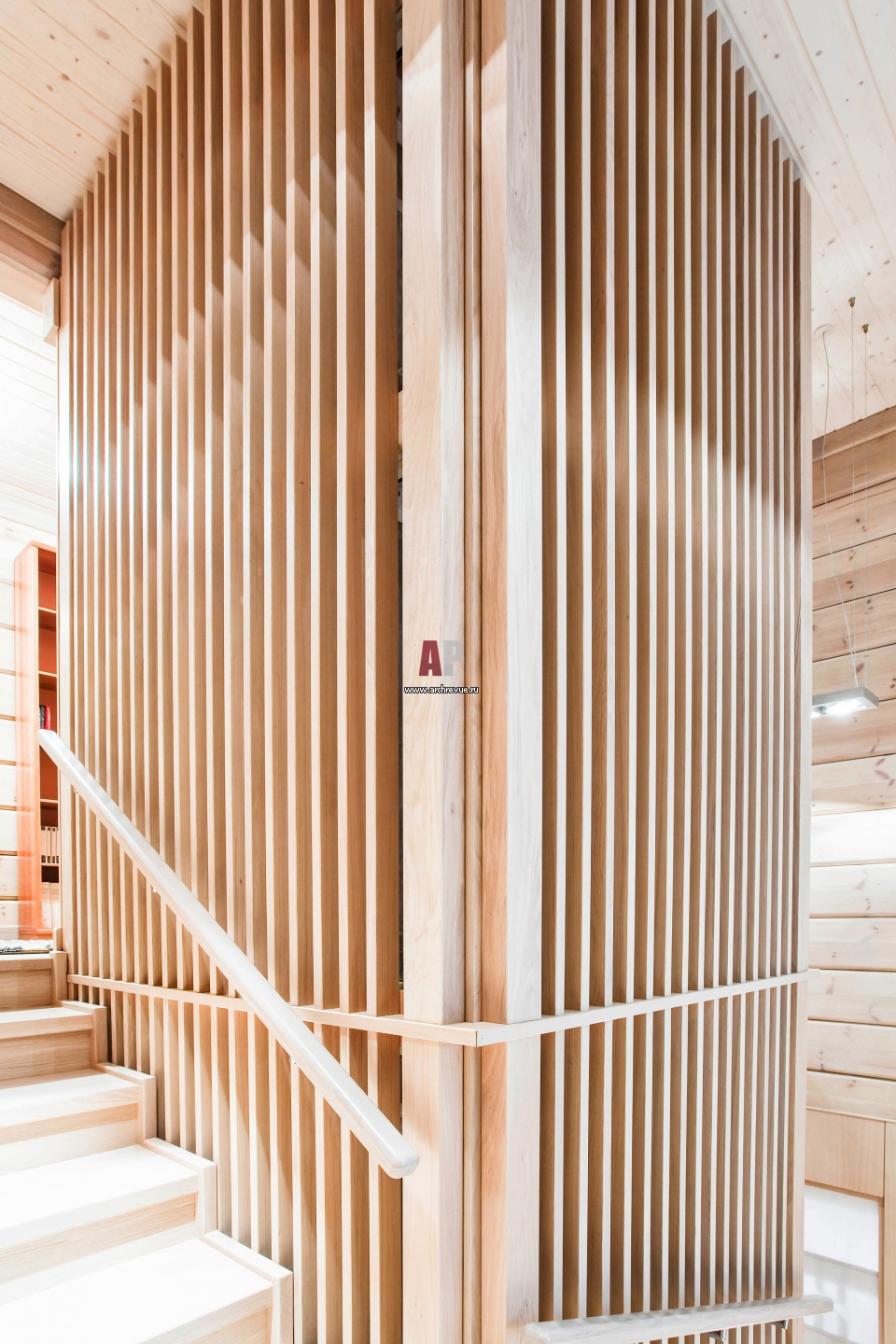 Опоры лестницы задекорированы деревянными рейками.