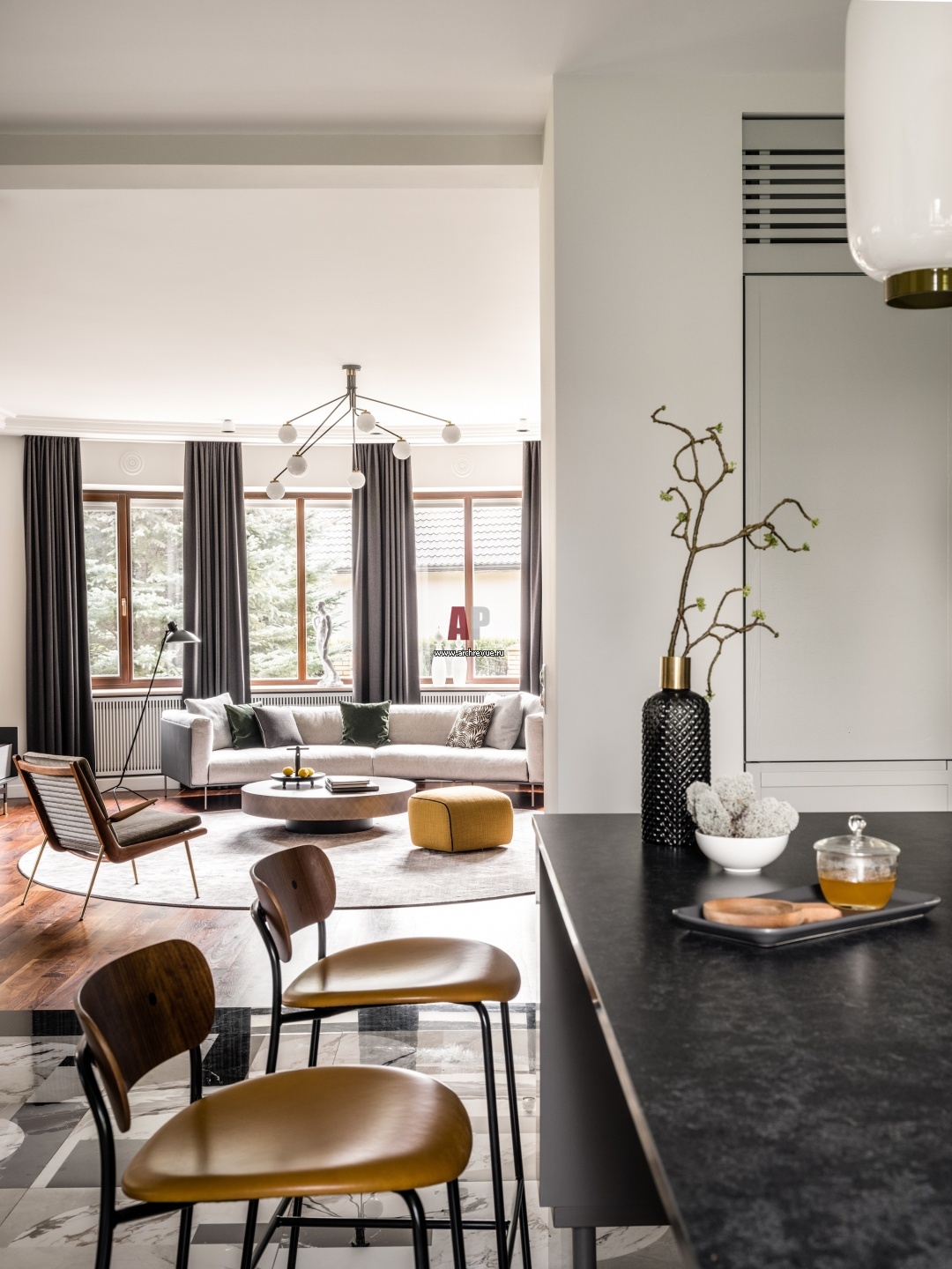Реконструкция дома в Новой Москве. Общая гостиная-кухня. Дизайнер реконструировала объем: одну колонну убрала, другую спрятала.