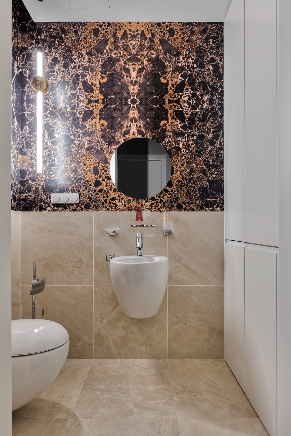 Гостевой санузел. Лейтмотивом интерьера стали радиальные элементы, поэтому выбрана сантехника округлых форм.