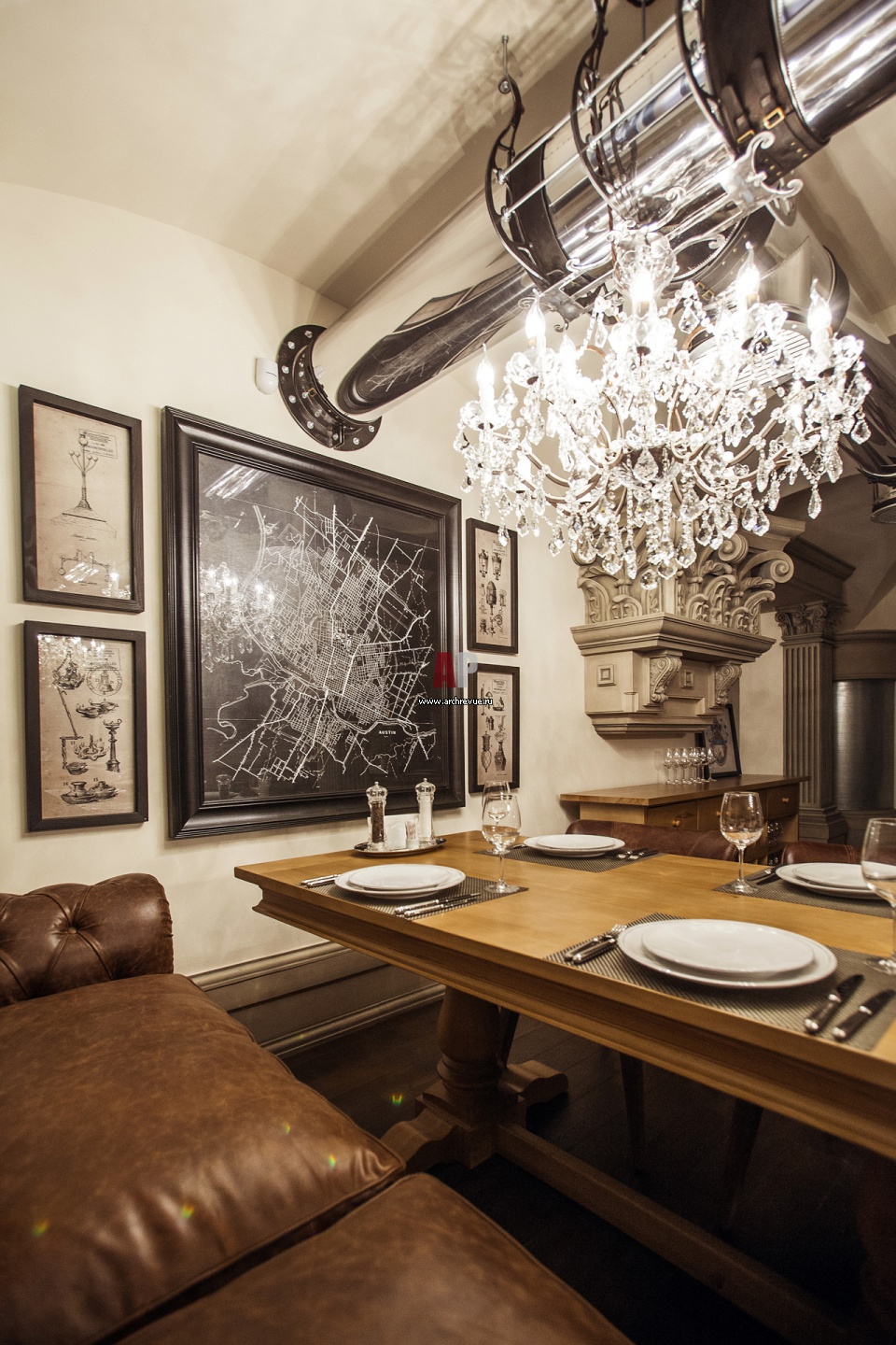 Зал ресторана в стиле фьюжн. Украшение интерьера – постеры с изображением старинных карт и указателей из метрополитена.