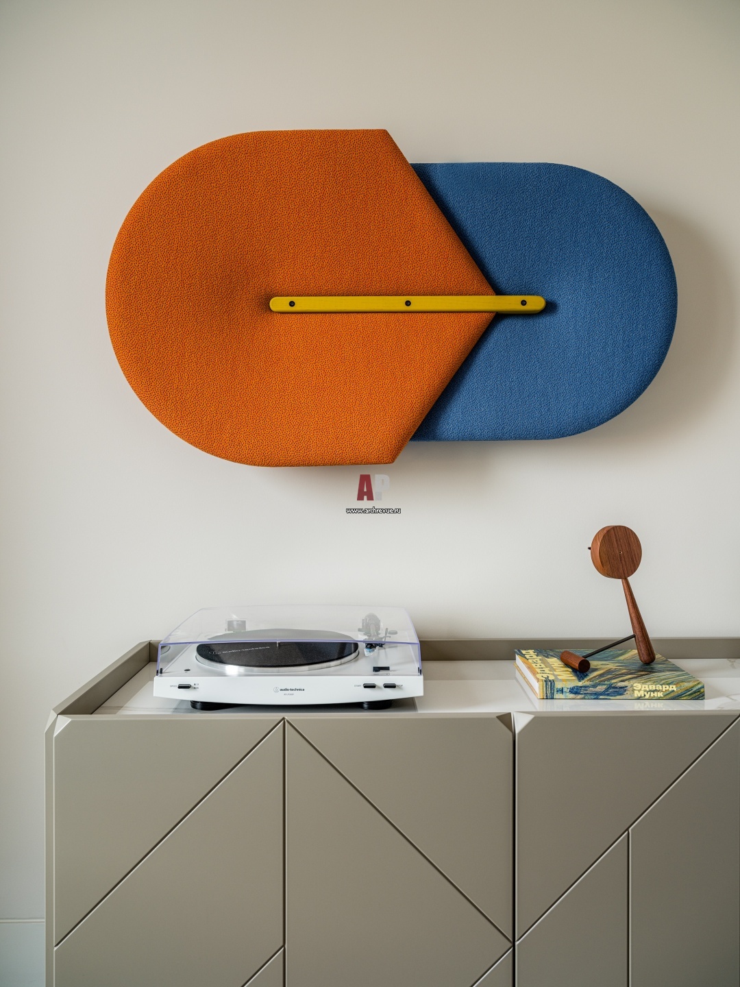 Интерьер кабинета. Акустическая панель Sancal. Тумба для проигрывателя, Bontempi.
