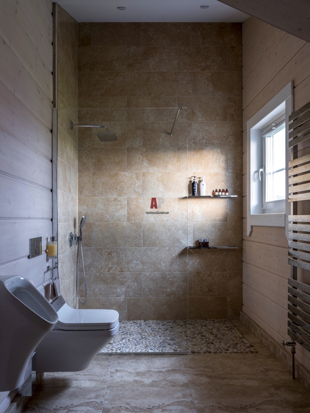 Зона душевой в одном из санузлов. Стены, пол – керамогранит с фактурой песчаника, ItalON. На поду душевой – галька. Унитаз, биде, Duravit. Смесители, Hansgrohe.