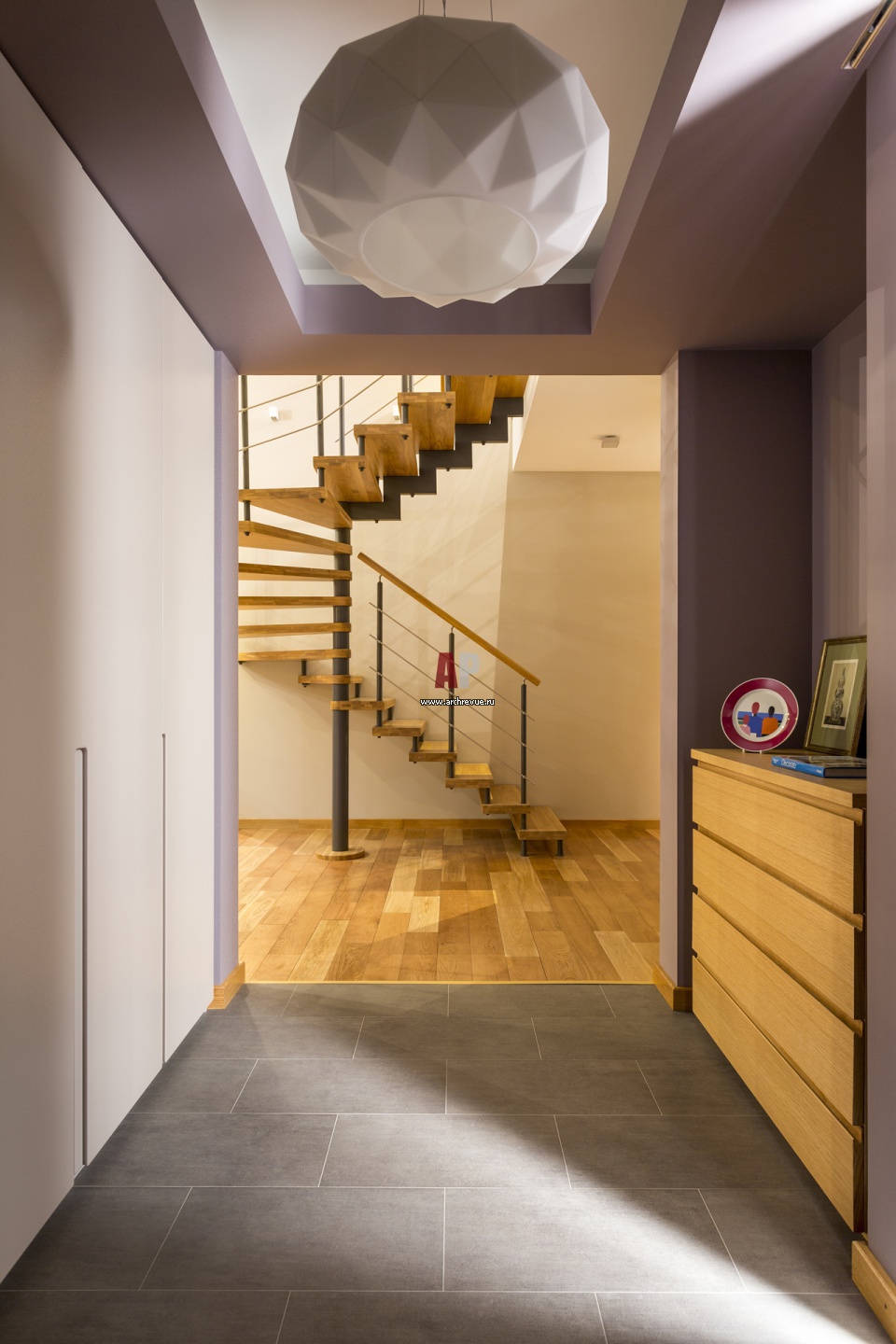 Вид из прихожей на лестничный холл. Ступени и ограждение балкона второго этажа выполнены из светлого дуба. Несущие элементы металлические.