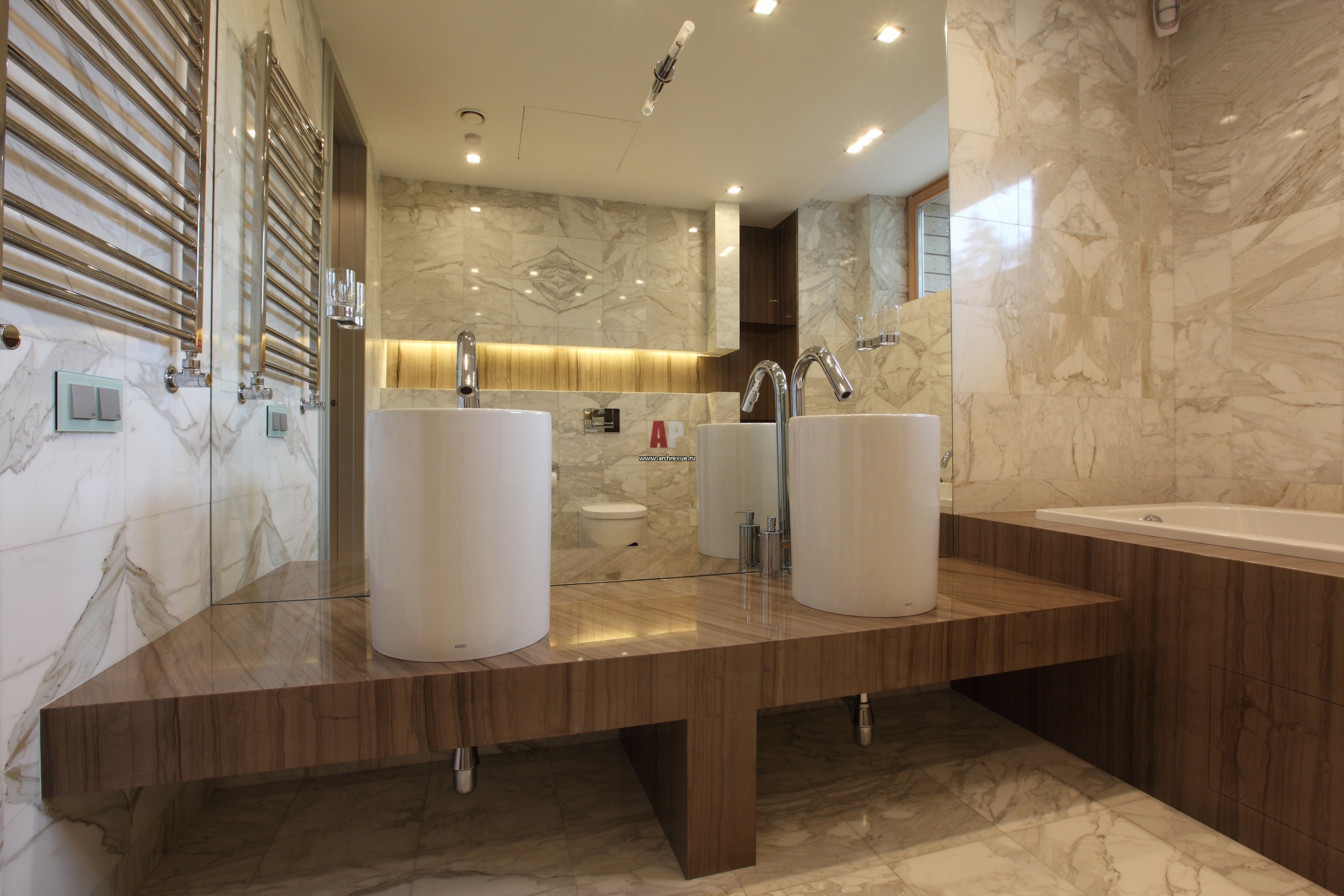 Раковины в гостевом санузле похожи на фарфоровые бочки. Мрамор, поставщик «Старк-Камень».