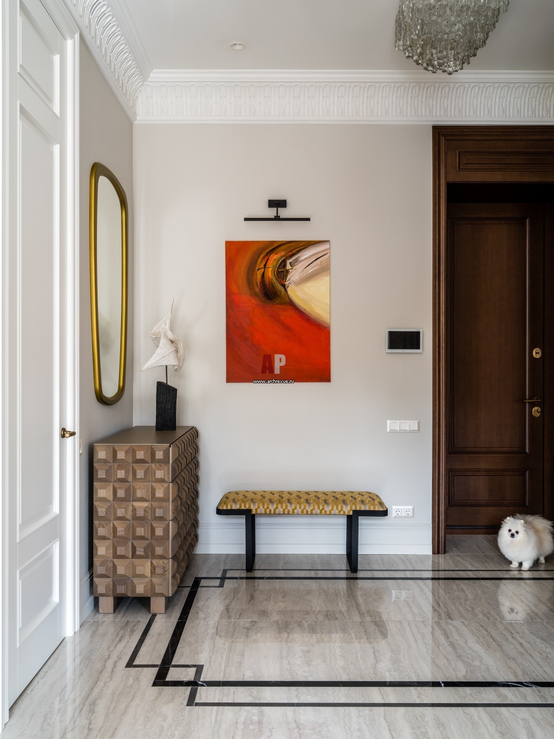 Прихожая. На полу – геометрическое панно из натурального камня. Светильники, винтаж, из кинотеатра «Художественный».