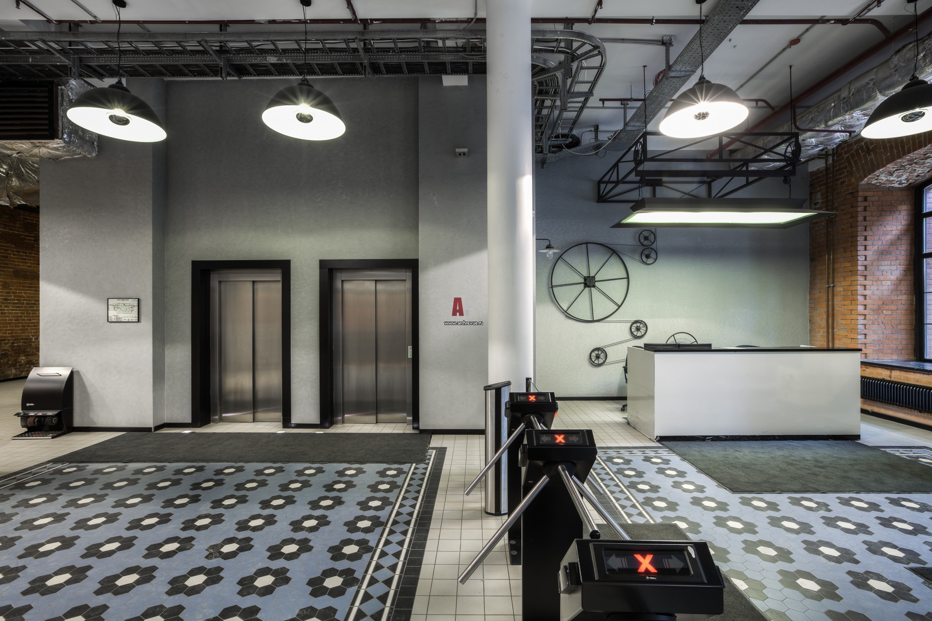Входная группа с электронными турникетами, лифтовых холлом и ресепшен. Панно на стене за ресепшен эффектно обыгрывает прошлое суконной мануфактуры.