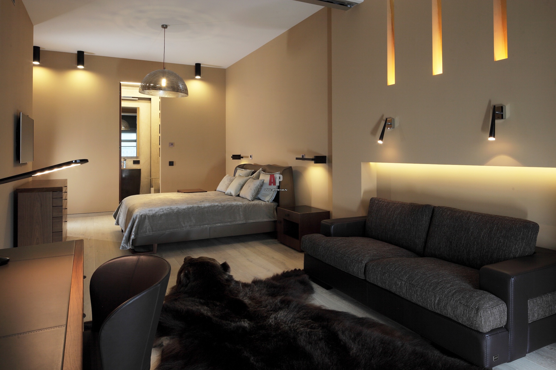 Интерьер спальни решен в плотных тонах, поскольку помещение хорошо освещено. Мебель с отделкой из темной кожи.