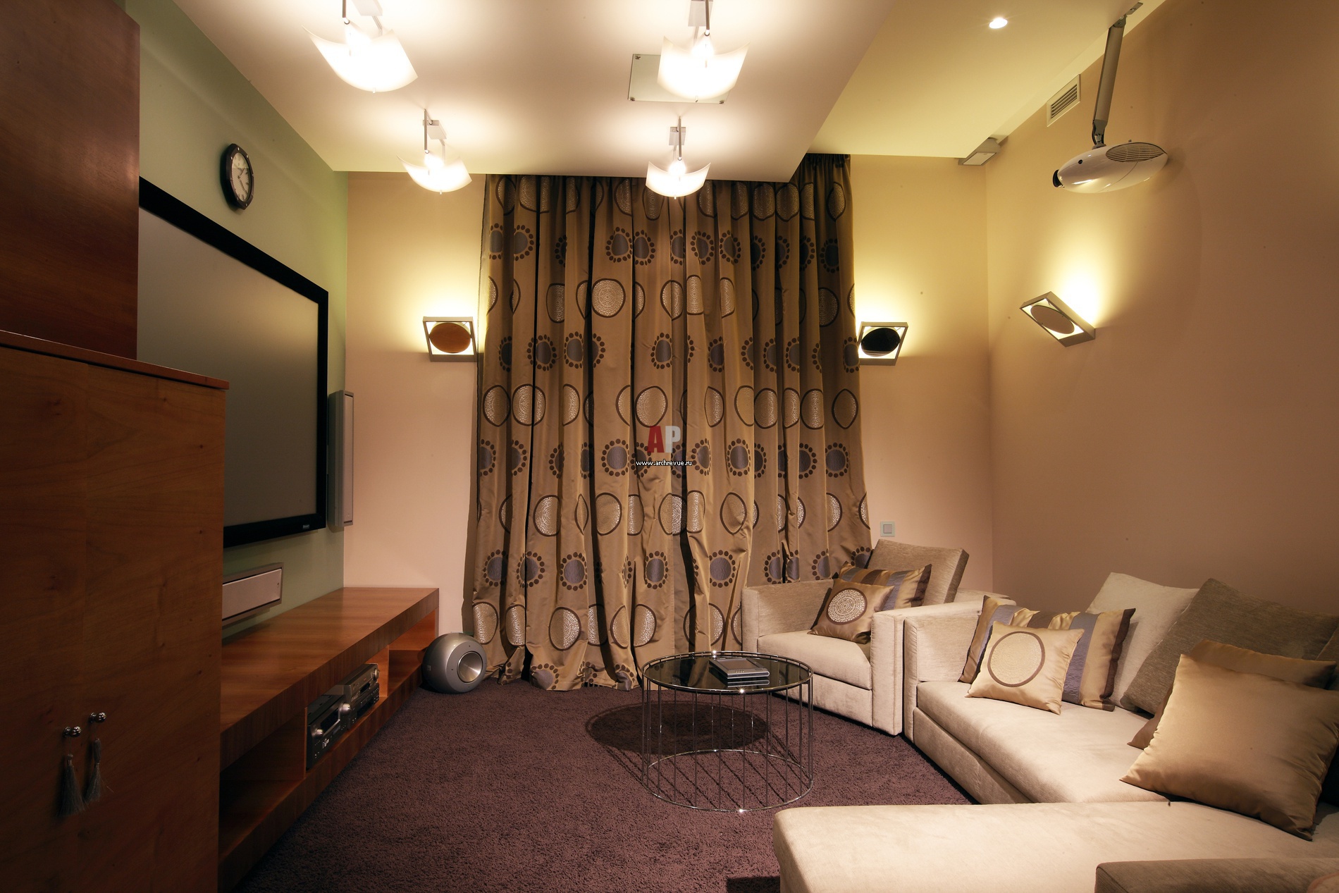 Профессиональный домашний кинотеатр занимает отдельное помещение. Экран стационарный, оборудование из дизайнерских коллекций.