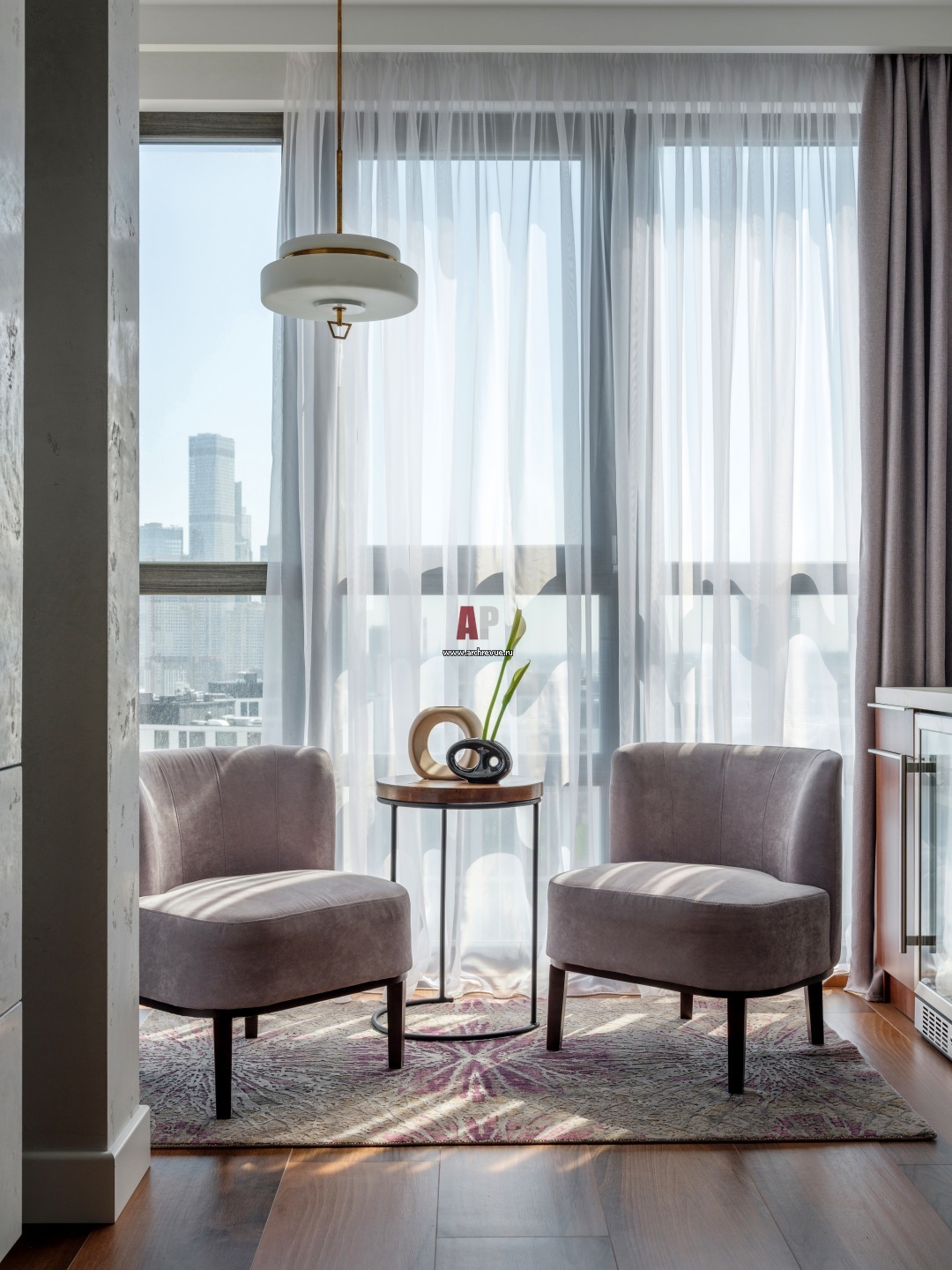 Особое пожелание заказчиков – распложенная на утепленной лоджии винная зона с баром, лаунджем и винным шкафом у панорамного окна. Кресла, винтаж.