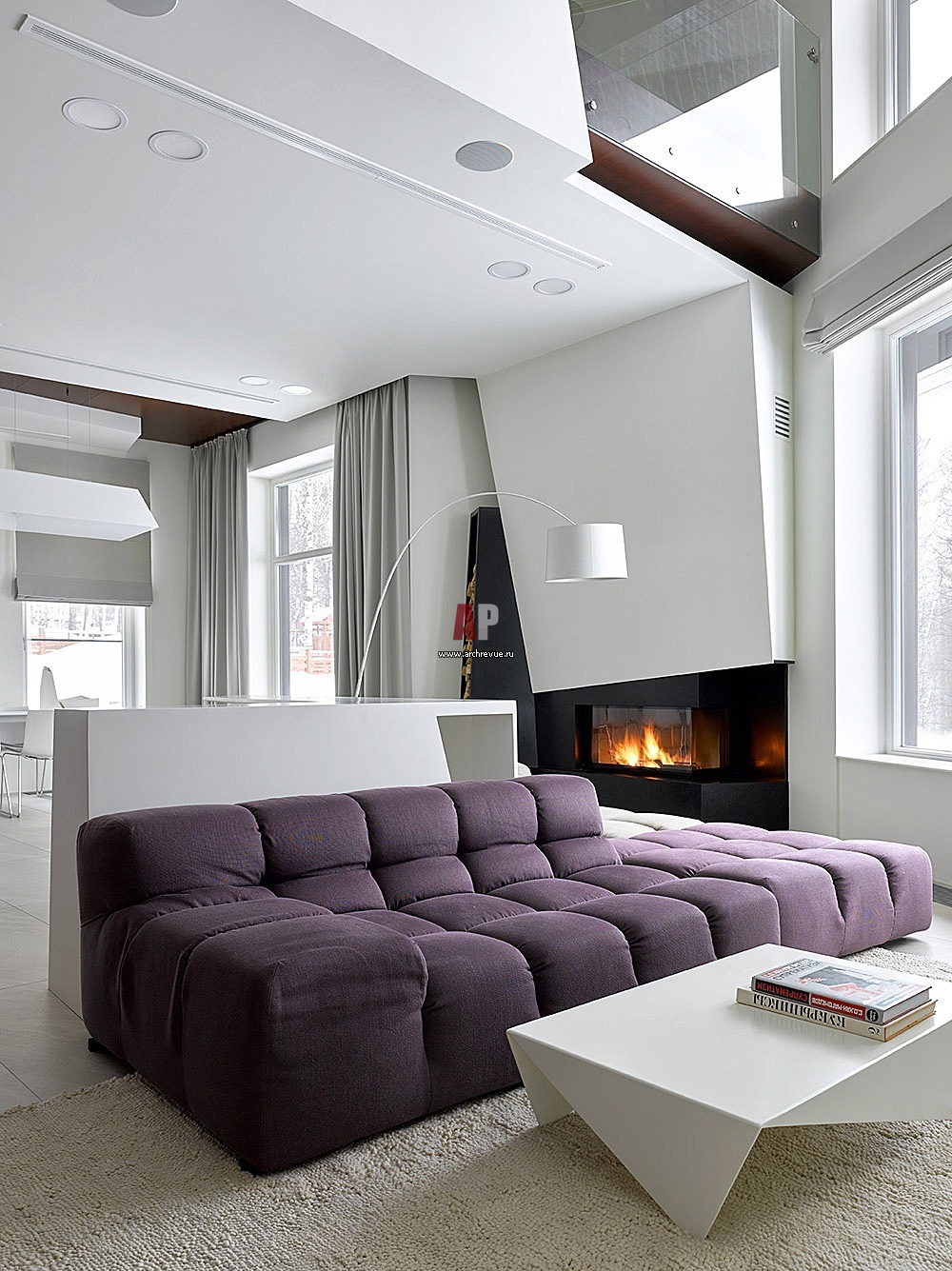Зона отдыха возле камина. Чтобы скорректировать сложную геометрию помещения, угловой модульный диван B&B Italia развернут «наружу».