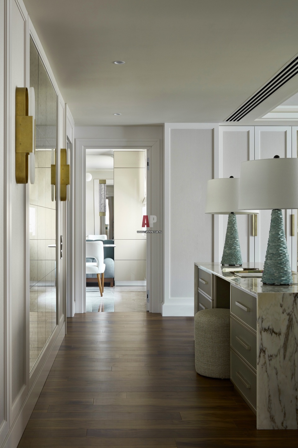 Гостиную от сквозного прохода отделяет рабочий стол. Он выполнен на заказ, по эскизам дизайнера. Столешница – мрамор Calacatta; фасады – кожа Lealpell.