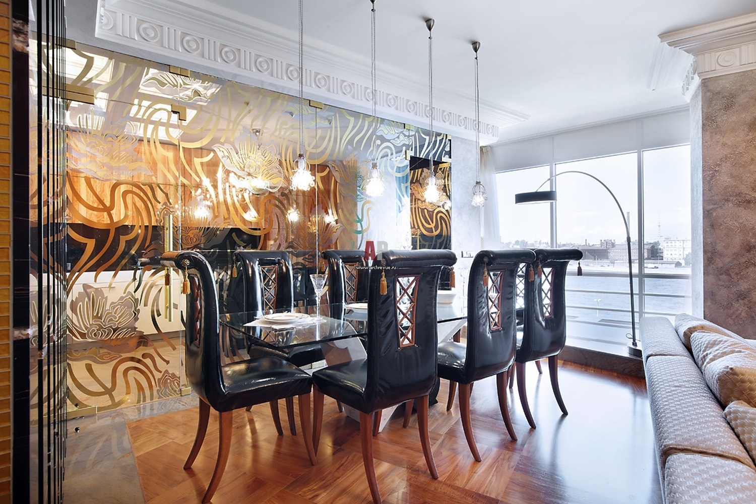 Хозяева любят много готовить. Кухня отделена от гостиной стеклянной перегородкой с золотым рисунком, что позволило визуально сохранить помещение единым, но, в тоже время, преградить дорогу всем кухонным запахам и звукам.