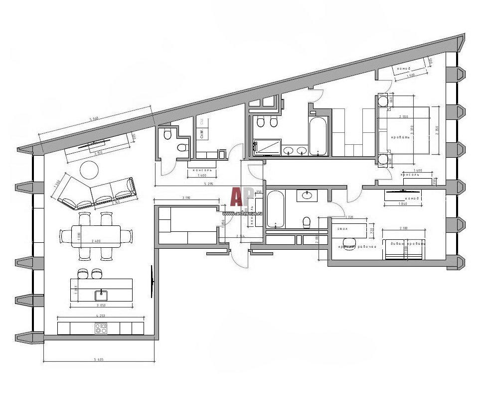 План трехкомнатной квартиры в ЖК «Бродский». Общая площадь – 153 кв. м.