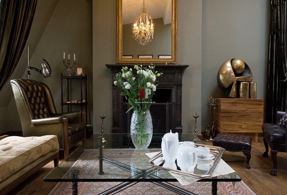 Фото интерьера каминной группы в эклектичной двухуровневой квартире с мансардой.