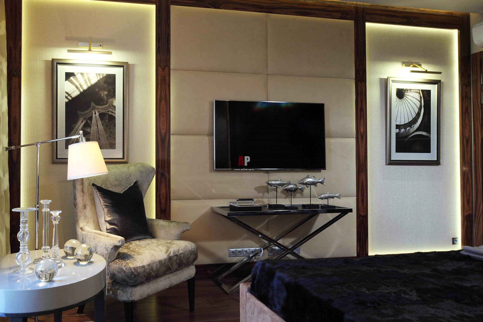 Композиция ТВ – отзеркаленное оформление стены за изголовьем кровати. Плазма помещена на панели, обитые тканью.
