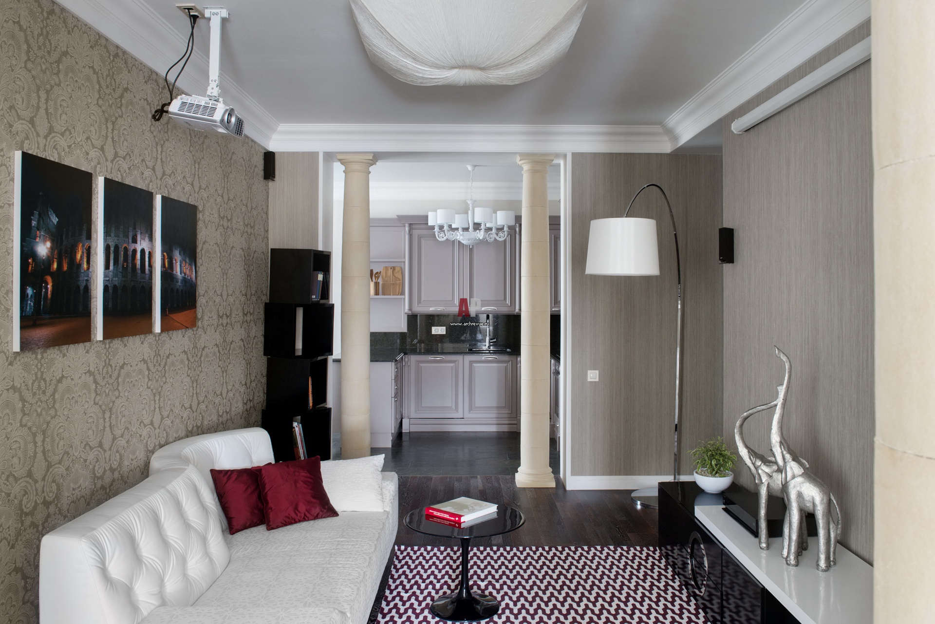 Интерьер гостиной в стиле фьюжн. Широкие порталы украшены колоннами из шамота. Диван с волнообразно изогнутой спинкой. Серебряные статуэтки-слоны.